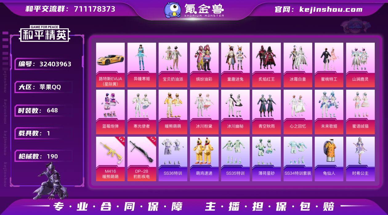 【kyhp400】安卓 手Q-7粉装-12特效枪-2载具-6粉色飞行器-70428热力值-8王牌印记-150套装-233枪皮 【热门品类】:粉装-梦幻火箭,套装-浪漫天命,套装-龟仙人,套装-潮萌小黄鸭,套装-浪漫波比 【粉色套装】:粉装-宝贝奶油派,粉装-梦幻火箭,粉装-橘柚倾心,角色-小蓝,套装-创世·救赎,角色-樱桃泡泡,角色-凤凰座 一辉 【粉色枪皮等级】:AKM-炫紫旋律(四级),SCAR-L-锦绣绵绵(五级),M416-电玩时刻(五级),AUG-暖羊咩咩(五级),UZI-筑梦精灵(七级),UMP45-量子极限(五级),AKS-74U-森灵之息(四级),Kar98K-巳巳如意(五级),AWM-橘柚倾心(一级),DP-28-豹影疾电(三级),MG3-洛神天依(七级),MG-36-沧焰双生(五级) 【粉色载具】:双人摩托-梦幻火箭,晶梦灵驹 【粉色枪皮】:AKM-炫紫旋律,SCAR-L-锦绣绵绵,M416-电玩时刻,AUG-暖羊咩咩,UZI-筑梦精灵,UMP45-量子极限,AKS-74U-森灵之息,Kar98K-巳巳如意,AWM-橘柚倾心,DP-28-豹影疾电,MG3-洛神天依,MG-36-沧焰双生 【粉色飞行器】:神秘黑猫飞行器,电糖天使飞行器,幻海精灵飞行器,彩虹独角兽飞行器,圣域金龙飞行器 【粉色降落伞】:梦幻火箭降落伞,恐龙拽拽降落伞,橘柚倾心降落伞,垂柳戏鸭降落伞,彩虹甜喵降落伞,沙丘之主降落伞,蜜语绒猫降落伞,精灵梦叶罗丽降落伞,千金淑猫降落伞,月下星之子降落伞,喜羊羊与灰太狼降落伞,流光夜莺降落伞 【稀有套装】:套装-龟仙人,套装-绒宝小鹅,套装-巳巳如意,角色-都市丽猫,套装-燕燕于飞,套装-鱼渊荷华,角色-海琴烟,玩偶服-小狗蛇点点,套装-晶灵使者,套装-晶辉守护,套装-雪夜云雾,套装-风舞幻音,套装-紫幽梦,套装-蓝冰羽,玩偶服-美羊羊,玩偶服-喜羊羊,套装-书海巡游,套装-画境星梦,套装-琴音绮想,套装-红釉青花,角色-霜纹水星 【稀有枪皮】:AKM-夜灯,AKM-恐龙拽拽,AKM-灼热...