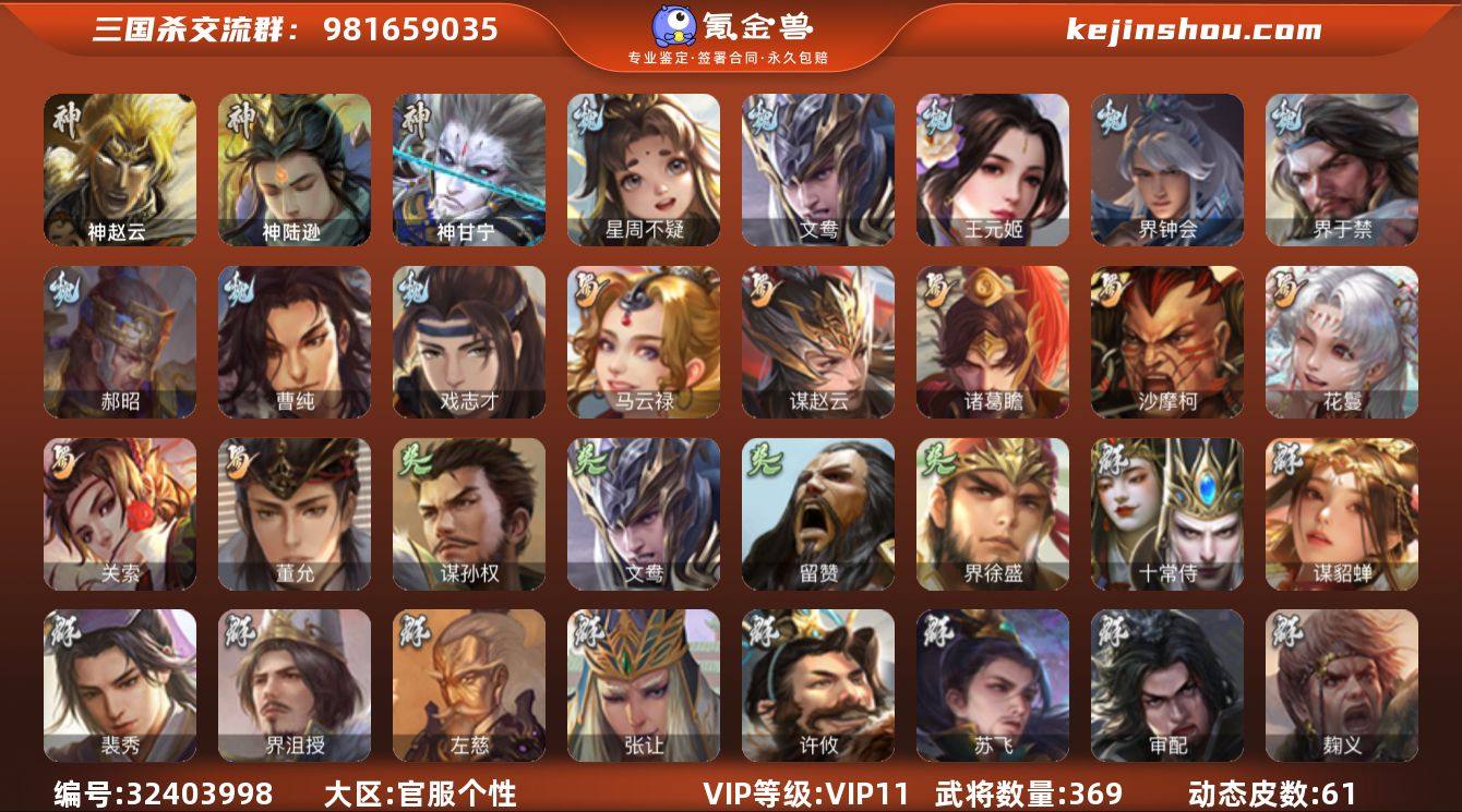 【427】官阶:大将军;VIP等级:VIP11;史诗武将数量:37;动态皮肤数量:61;武将总数:369;史诗宝珠数量:11;将魂数量:666;神将:5;魏国史诗武将:15;蜀国史诗武将:7;吴国史诗武将:3;群史诗武将:19