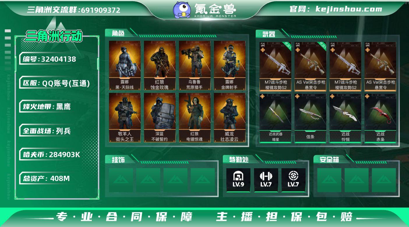 【赛季热门多刀号+热门双红皮+二典藏皮肤/s8赛季3*3·高额资产408M】【暗星.信条.怜悯.赤枭.蚀金玫瑰.黑天际线】【Q区三端互通】【无二次】YXz8901-特勤处:仓库9级/靶场7级/训练中心7级-总资产408m-哈夫币284m-烽火等级:60级 【干员外观】:红狼-蚀金玫瑰,露娜-黑·天际线,威龙-壮志凌云,蜂医-送葬人·无题密令,牧羊人-街头之王,无名-夜鹰,深蓝-不破誓约,红狼-电锯惊魂,露娜-金牌射手,乌鲁鲁-荒原猎手 【近战皮肤】:近战-暗星,近战-信条,近战-怜悯,近战-赤枭,近战-黑鹰 【典藏外观】:M7战斗步枪-棱镜攻势S2,AS Val突击步枪-悬赏令 【典藏外观成色】:M7战斗步枪-棱镜攻势S2(优品S),AS Val突击步枪-悬赏令(优品S) 【传说外观】:M4A1突击步枪-蚀金玫瑰,M4A1突击步枪-阿米娅,QBZ95-1突击步枪-凌霄戍卫,ASh-12战斗步枪-鹅鸭杀,K416突击步枪-行动记录,M7战斗步枪-怜悯,M7战斗步枪-维京,SG552突击步枪-运动员,AK-12突击步枪-夜鹰,AK-12突击步枪-特斯拉线圈,SCAR-H战斗步枪-铁艺苍穹,SCAR-H战斗步枪-启航,G3战斗步枪-骑士,CAR-15突击步枪-阿米娅,AS Val突击步枪-蛇年祥瑞,腾龙突击步枪-捞点薯条,腾龙突击步枪-马年祥瑞,腾龙突击步枪-万金泪冠,KC1...