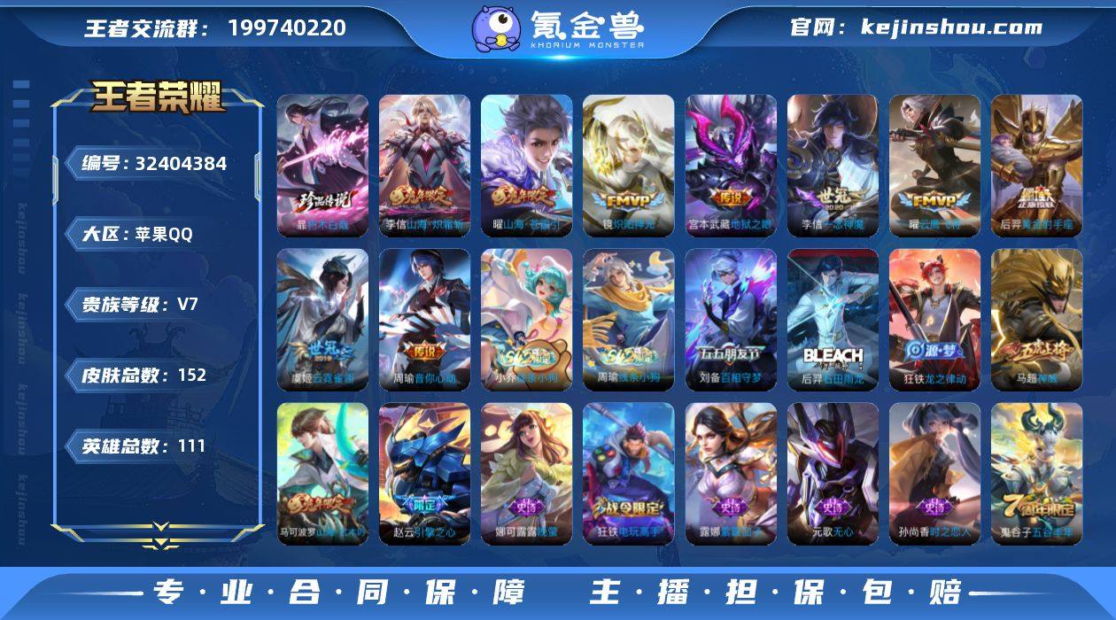 无二次-苹果Q-V7-最强王者段位-111英雄-152皮肤-1珍品传说-9传说-40史诗 【英雄全皮】:孙权全皮 【珍品传说】:暃朽木白哉 【传说皮肤】:曜山海苍雷引,李信山海炽霜斩,周瑜音你心动,镜炽阳神光,曜云鹰飞将,李信一念神魔,虞姬云霓雀翎,后羿黄金射手座,宫本武藏地狱之眼 【限定皮肤】:狄仁杰阴阳师,赵云皇家上将,赵云引擎之心,高渐离玩趣恶龙,钟无艳超时空战士,元歌无心,甄姬落雪兰心,马可波罗山海玄木吟,狄仁杰魔术师,项羽海滩派对,王昭君午后时光,刘备百相守梦,李元芳云中旅人,鬼谷子五谷丰年,沈梦溪大漠名商,沈梦溪匿光破解者,裴擒虎擒涛扼浪,狂铁电玩高手,李信山海炽霜斩,上官婉儿梁祝,嫦娥暖冬兔眠,曜山海苍雷引,鲁班大师探海日志,桑启海盐诗旅,暃星界游侠,张良古海寻踪,蒙犽百解令,鬼谷子天穹祈灯 【年限皮肤】:曜山海苍雷引,李信山海炽霜斩,马可波罗山海玄木吟 【赛季限定】:沈梦溪大漠名商,李元芳云中旅人,桑启海盐诗旅,裴擒虎擒涛扼浪,鲁班大师探海日志,张良古海寻踪,鬼谷子天穹祈灯,钟馗虚灵犬护,甄姬逆浪荇歌 【战令限定】:狂铁电玩高手,王昭君午后时光,钟无艳超时空战士,甄姬落雪兰心,暃星界游侠,嫦娥暖冬...