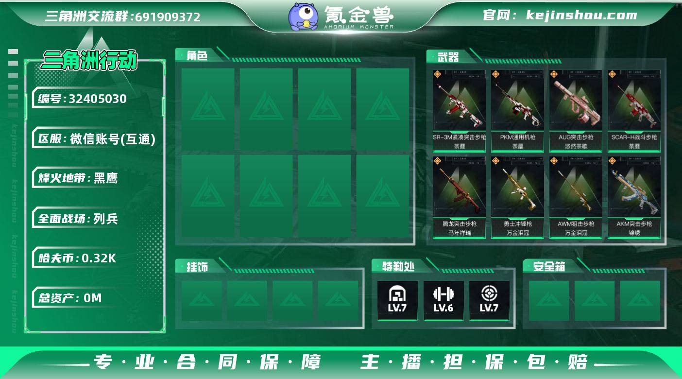 实名: 不可修改 烽火地带段位: 黑鹰 全面战场段位: 列兵 总资产: 394 哈夫币: 322 传说武器皮肤: 腾龙突击步枪-马年祥瑞,SCAR-H战斗步枪-荼蘼,PKM通用机枪-荼蘼,SR-3M紧凑突击步枪-荼蘼,勇士冲锋枪-万金泪冠,AWM狙击步枪-万金泪冠,AKM突击步枪-锦绣,AUG突击步枪-悠然茶歇