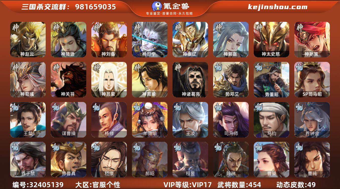 【4407】官阶:大将军;VIP等级:VIP17;史诗武将数量:80;动态皮肤数量:49;武将总数:454;史诗宝珠数量:0;将魂数量:177;神将:10;魏国史诗武将:36;蜀国史诗武将:13;吴国史诗武将:9;群史诗武将:28 神赵云,神陆逊,神刘备,神甘宁,神张辽,神郭嘉,神太史慈,神孙策,神荀彧,神诸葛亮,SP司马昭,王粲,谋曹操,杨修,羊徽瑜,王凌,司马师,马钧,界钟会,界于禁,界曹真,嵇康,郝昭,陈琳,曹婴,曹纯,戏志才,刘晔,势董昭,程昱,势邓艾,关索,马云騄,谋赵云,诸葛瞻,周群,赵襄,张星彩,王平,沙摩柯,谯周,界黄忠,花鬘,董允,周处,吴景,孙皓,骆统,留赞,界朱然,界徐盛,界步练师,贺齐,皇甫嵩,左慈,张仲景,张让,张琪瑛,星黄忠,星甘宁,王允,陶谦,苏飞,司马徽,审配,麹义,庞德公,南华老仙,祢衡,刘璋,刘焉,沮授,界左慈,界李儒,公孙康,杜预,陈登,卑弥呼,许攸,兀突骨,士燮,神吕蒙,神周瑜,神关羽,势夏侯尚,SP关羽,SP曹仁,SP蔡文姬,乐进,曹昂,诸葛诞,朱灵,文聘,SP姜维,张春华,钟会,曹冲,郭淮,满宠,界王异,界曹操,界司马懿,界夏侯惇,界张辽,界许褚,界郭嘉,李典,曹真,韩浩史涣,陈群,曹叡,曹休,钟繇,司马朗,王基,李通,郭皇后,孙资刘放,辛宪英,界甄姬,吕虔,鲁芝,蒯越蒯良,界典韦,界荀彧,界徐晃,杜畿,界曹丕,毌丘俭,界...