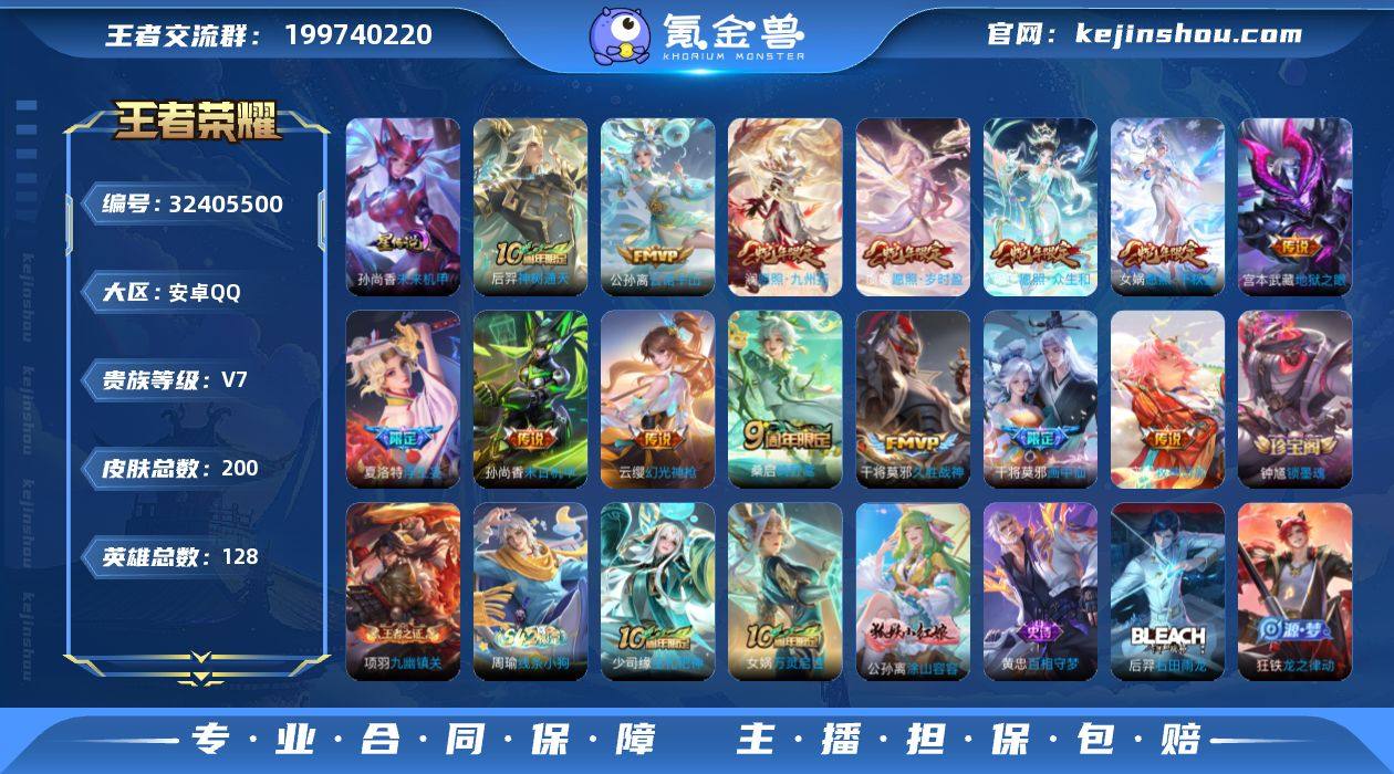 苹果Q-V6-最强王者段位-113英雄-100皮肤-1无双-10传说-29史诗 QW26308 【无双皮肤】:李白碎月剑心 【传说皮肤】:云缨神骥越千峰,花木兰异界灵契,后羿神树通天,澜愿照九州拓,虞姬愿照岁时盈,云缨幻光神枪,露娜霜月吟,夏洛特浮生妄,花木兰冠军飞将,宫本武藏地狱之眼 【限定皮肤】:蒙犽顽岩魄,姜子牙天穹之誓,狄仁杰阴阳师,赵云皇家上将,孙尚香蔷薇恋人,狄仁杰魔术师,项羽海滩派对,百里玄策原初追逐者,夏洛特浮生妄,鬼谷子天穹祈灯,李白碎月剑心,沈梦溪龙舞盛年,刘邦剑破天穹,程咬金群星魔术团,周瑜熔金海岸 【年限皮肤】:澜愿照九州拓,虞姬愿照岁时盈 【赛季限定】:鬼谷子天穹祈灯,刘邦剑破天穹,姜子牙天穹之誓,太乙真人谧流熔炉,钟馗虚灵犬护,甄姬逆浪荇歌,亚瑟荣光之誓,百里玄策原初追逐者 【战令限定】:孙膑茶境仙,马超访茗客,周瑜线条小狗 【史诗皮肤】:周瑜线条小狗,少司缘巫礼祀神,女娲万灵启世,后羿石田雨龙,狂铁龙之律动,阿轲化蝶舞,狄仁杰绮世丹青,赵怀真器灵浮梦炉,孙膑茶境仙,蒙犽顽岩魄,百里玄策原初追逐者,橘右京修罗,狄仁杰鹰眼统帅,阿轲节奏热浪,白起星夜王子,铠曙光守护者,亚瑟心灵战警,诸葛亮黄金分割率,兰陵王暗隐猎兽者,花木兰水晶猎龙者,李白千年之狐,妲己魅力维加斯,孙尚香水果甜心,孙尚香蔷薇恋人,宫本武藏鬼剑武藏,狄仁杰魔术师,王昭君偶像歌手,甄姬冰雪圆舞曲,赵云皇家上将,露娜紫霞仙子 【其他皮肤】:兰陵王雾影缉谜,曹操逐霄之志,艾琳鹤鸣心笺,亚瑟荣光之誓,甄姬逆浪荇歌,白起死霸装,露娜命运加冕,钟馗虚灵犬护,刘备浪漫序章,戈娅玫蓝誓约,明世隐景韶洛都,马超访茗客,太乙真人谧流熔炉,盘古敬我三分,周瑜熔金海岸,姜子牙天穹之誓,程咬金群星魔术团,刘邦剑破天穹,沈梦溪龙舞盛年,鬼谷子天穹祈...