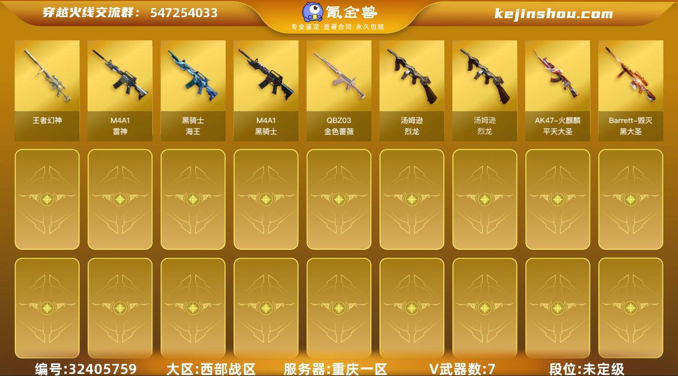 重庆一区-7V-1王者武器数-0炫金武器数 【热门武器】:王者幻神,QBZ03-金色蔷薇,M4A1-黑骑士,汤姆逊-烈龙 【王者炫金武器】:王者幻神 【皮肤】:火麒麟-平天大圣,毁灭-黑大圣皮肤 【角色】:娟娟,灵狐者-黄金海岸,潘多拉-X,潜龙队-X,邱刚敖,青霞仙子,蜀雪,铁骑荣耀 【人偶武器】:迷你牛魔王 【挑战大师】:AK47-冰龙粉碎者 【英雄级武器】:M4A1-雷神,M4A1-黑骑士,QBZ03-金色蔷薇,黑骑士-海王*2,汤姆逊-烈龙 【道具】:夺命之镰,防化服,防弹头盔*4,防弹衣*4,C4工具钳*3,手雷包 【特殊枪械】:1黑骑士,1烈龙