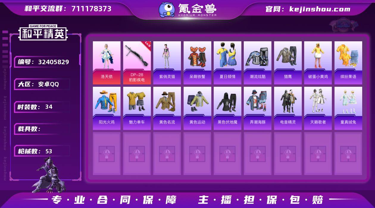 安卓 手Q-3粉装-2特效枪-0载具-0粉色飞行器-21153热力值-3王牌印记-52套装-77枪皮【粉色套装】:角色-荧海星豚,角色-奇迹舞步 美琪,角色-奇迹舞步 美雪【粉色枪皮等级】:Kar98K-巳巳如意(五级),DP-28-豹影疾电(五级)【粉色枪皮】:Kar98K-巳巳如意,DP-28-豹影疾电【粉色降落伞】:萌物绒绒降落伞,戏水时光降落伞,幻彩电音降落伞,奇迹舞步降落伞【稀有套装】:套装-绒宝小鹅,套装-巳巳如意,套装-乐游熊熊,套装-糖糖葫芦,套装-青团波波,套装-棉花软糖,套装-星影赞美诗,套装-霓虹热舞,套装-彩虹兔,套装-云朵鹅,套装-雪绒豹,套装-朱霞炽焰,套装-凌霄紫焰,套装-擎苍青焰,玩偶服-喜羊羊,角色-绯色魅影【稀有枪皮】:M16A4-千金淑猫,SCAR-L-炫彩节奏,SCAR-L-红色方程式,M416-红色方程式,AUG-耀粉歌者,M762-彩虹符号,M762-云朵鹅,G36C-星穹咏叹调,ARX-凌霄紫焰,UZI-啾咪啾咪,UZI-月影灵韵,UMP45-绒宝小鹅,JS9-凌霄紫焰,P90-巳巳如意,AWM-奇迹舞步,Mini14-绯穹魔姬,SVD-云朵鹅,S686-生命誓言,S686-巳巳如意,S1897-荧海星豚,DBS-幻彩电音,SPAS-12-云朵鹅,M249-糯团青竹,DP-28-彩虹符号,MG3-第五大道,MG-36-凌霄紫焰,P92-凌霄紫焰,信号枪-奇迹舞步,蝎式手枪-虹云熊熊,沙漠之鹰-云朵鹅,爆炸猎弓-喜羊羊与灰太狼,大砍刀-云朵鹅,平底锅-凌霄紫焰,破片手榴弹-巳巳如意【其他套装】:套装-柠萌假日,套装-深蓝色名流,套装-玉兔迎春,套装-破蛋小黄鸡,套装-缤纷果语,套装-耀粉歌者,套装-顽皮玉兔,套装-鹤鸣,套装-黑色伏地魔,套装-童真绒兔【营地ID】:969319622