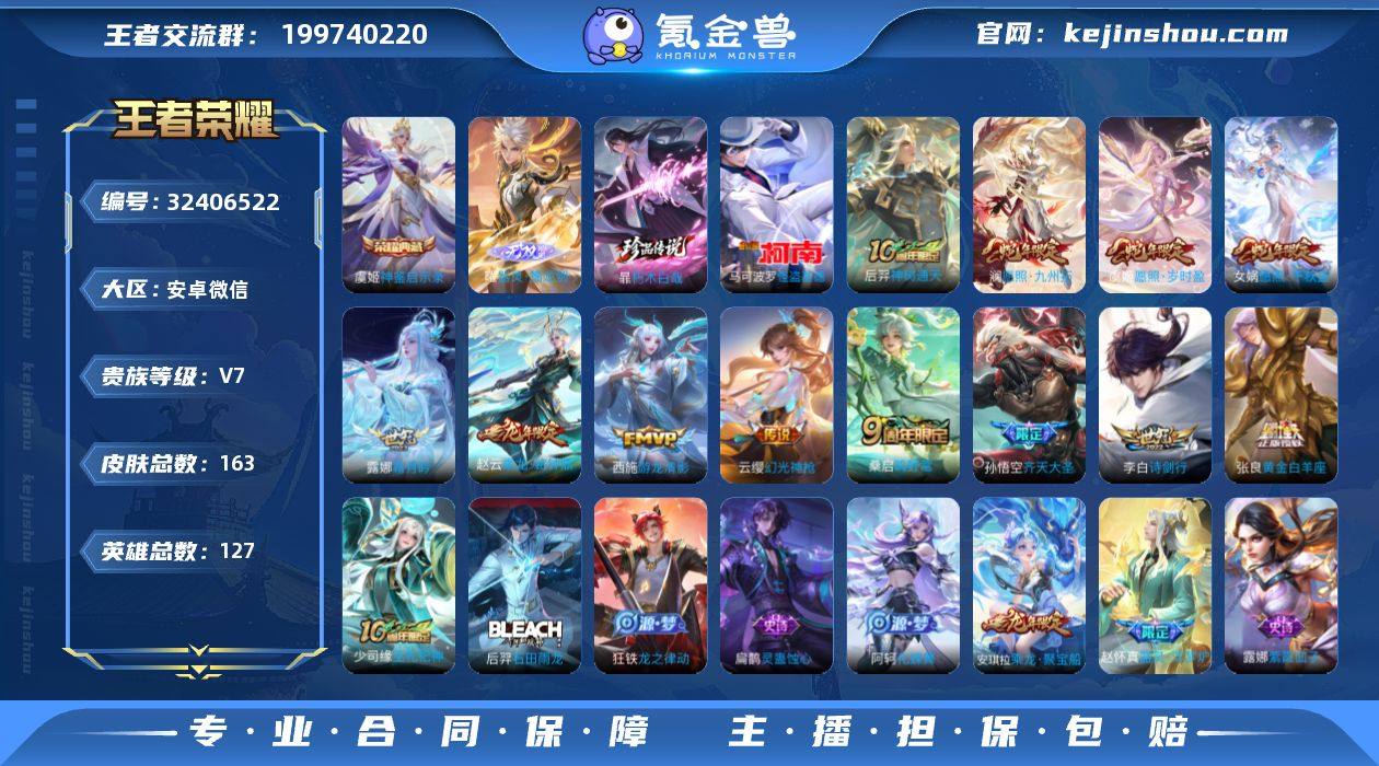 实名: 可修改 性别: 男号 贵族等级: V7 英雄数: 127 皮肤数: 163 荣耀水晶: 神鉴启示录 无双皮: 器灵·螭龙剑 珍品传说: 怪盗基德,朽木白哉 传说皮: 黄金白羊座,游龙清影,霜月吟,乘龙·铭钟鼎,幻光神枪,神树通天 限定皮: 高山流水,五谷丰年,诗剑行,齐天大圣,鸣野蒿,愿照·千秋盛,愿照·岁时盈,愿照·九州拓 亮点: 【优质装备】:神鉴启示录,器灵·螭龙剑,怪盗基德,朽木白哉,黄金白羊座,游龙清影(小青龙),霜月吟