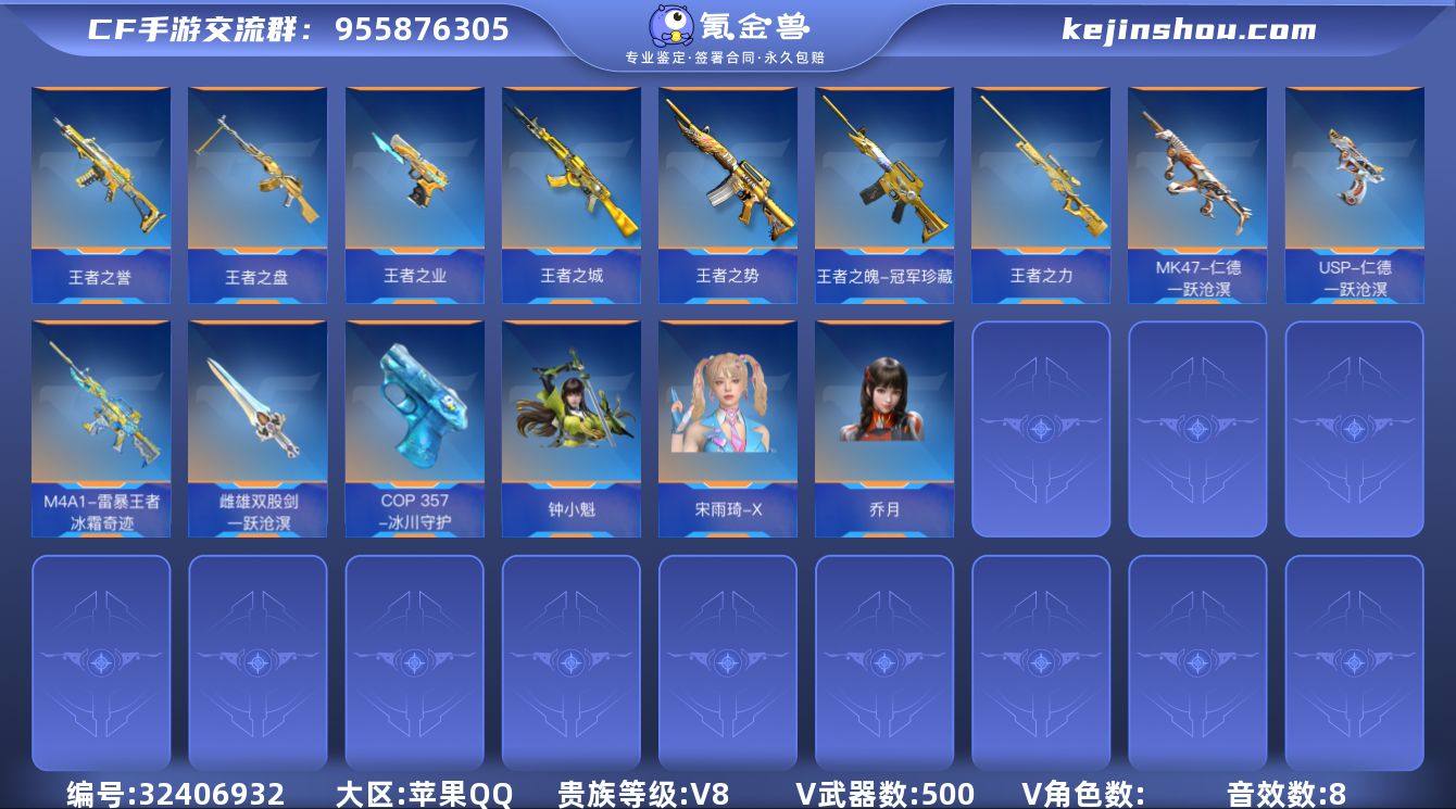 奉先(无双皮),仁德(一套一跃沧溟皮),威侯,元让,仲康,孟获,文远,盖,都是套装。仲达(烽火连城)差一把刀一套,星象,G3A3凤雏,云龙7件套,m200竞技荣光6件套。雷暴王者(冰霜奇迹),王者之势(燃竞之巅),王者之城(燃竞之巅)王者之力,王者之击,4把COP两把英雄级,角色钟小魁,乔月,11套手雷,王者级投掷15个 燃烧瓶16个,王者武器19。王者之钥78把。