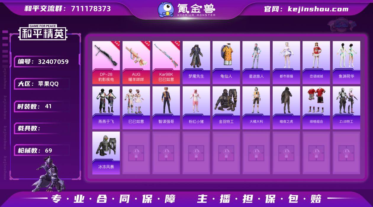 M1046978【AUG-暖羊咩咩[5级]3特效枪 暗夜之虎】苹果手Q-3特效枪-41套装-69枪皮-2王牌印记-英勇黄金Ⅰ-16976热力值【3特效枪】Kar98K-巳巳如意[5级],DP-28-豹影疾电[5级],AUG-暖羊咩咩[5级]【2飞行器】顶峰精英尾迹,炫彩糖果飞行器【107其它衣服和枪皮】炫彩糖果,大橘大利,缤纷果语,暗夜之虎,粉红小猪,红色运动,滨海厨神,战术大师,龙的传人,竞技名士,魅力单车,SS32特训,燕燕于飞,特战装甲,海盐绵绵冰,吉莉礼服,星途旅人,冰冻风暴,香桃花海,梦魇先生,玩偶服-小狗蛇点点,龟仙人,金羽特工,春日漫步,智谋强哥,SS33特训,鱼渊荷华,角色-瑰梦爱神,恋语绒绒,角色-都市丽猫,绯格组合,Z.I.B特工,龙魂突击队,猎鹰,夏日倾情,SS31特训,风暴特警,薄荷星砂,巳巳如意,超能勇士,SS34特训,UZI-冰河战士,Vector-燕燕于飞,DP-28-彩虹符号,S12K-夜灯,SCAR-L-海盐豹豹,铝热弹-炫彩糖果,Mini14-香桃花海,AUG-耀粉歌者,M16A4-千金淑猫,S12K-幻影战神,GROZA-紫矿核心,UZI-天降萌叽,蝎式手枪-燕燕于飞,SCAR-L-小狗蛇点点,SCAR-L-炫彩节奏,SPAS-12-燕燕于飞,M249-金丰海韵,十字弩-异域银装,M416-红色方程式,AUG-异域银装,P90-巳巳如意,PKM-啾咪啾咪,SKS-炫彩节奏,AKM-棋盘冕主,DBS-月影灵韵,DBS-彩虹符号,...