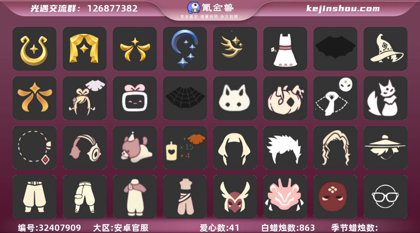 账号类型: 手机账号 季节已毕业: 魔法季,表演季,欧若拉季,夜行季,迁徙季 完成地图: 云野,雨林,霞谷,暮土 珍稀物品: 白枭,透明蝶翼斗,魔法季耳坠,咖喱 礼包: 蝙蝠套,巫师,欧若拉之翼,绊爱,大铁头,蜘蛛斗,兔子,南瓜,猫套,猫背饰,彩虹耳钉,彩虹耳机,奥利奥,创始人,向日葵连衣裙 裤子: 武士裤,背带裤,搓澡巾,蓝绿裤 面具: 贴花面具,夜行毕业面具,黄眉企鹅面具 面饰: 红耳机,黑框眼镜 发型: 若笠,虚荣,小王子发型,留辫蘑菇头 头饰: 行军锅头盔,蓝色音乐会,平顶帽 斗篷: 海洋斗,绿芽,粉红绒毛斗篷,燕尾斗篷 配饰: 雨伞,二重奏挂画 亮点: 【优质装备】:魔法季,魔法季耳坠(双边耳坠)(魔法耳坠),咖喱(阿拉丁帽),表演季,白枭(帝企鹅发),武士裤,透明蝶翼斗,欧若拉季(欧若拉),行军锅头盔(六边锅帽子)(双耳锅帽子),夜行季,蓝绿裤(高领舞服),二重奏挂画(合奏挂画),贴花面具(丛林黑面具),夜行毕业面具(棕熊面具),黄眉企鹅面具,黑框眼镜(粗框眼镜),小王子发型,留辫蘑菇头,粉红绒毛斗篷(绒毛斗篷),燕尾斗篷,蝙蝠套(蝙蝠斗篷)(南瓜头),欧若拉之翼,绊爱(绊爱斗篷)(绊爱礼包),猫套(皮皮猫斗)(皮皮猫礼包),红耳机,大铁头,蜘蛛斗(蛛丝斗篷)(蛛网斗篷),巫师(巫师帽),猫背饰(猫咪背饰),彩虹耳机,奥利奥...