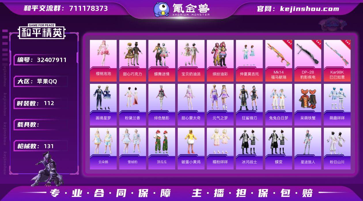 M1046954【公主对掏号6粉装-3特效枪 权威番茄 猪脸 巧克力头 花仙子】苹果手Q-6粉装-3特效枪-112套装-131枪皮-4王牌印记-荣耀皇冠Ⅰ-37789热力值【6粉装】角色-樱桃泡泡,仲夏莫吉托,甜心巧克力,宝贝奶油派,缤纷油彩,蝶舞迷情【3特效枪】DP-28-豹影疾电[5级],Kar98K-巳巳如意[5级],Mk14-福马献瑞[5级]【7飞行器】炫彩糖果飞行器,登顶巅峰飞行器,绯果甜心飞行器,破刃行动尾迹,异域银装飞行器,马上有福飞行器,狂鲨锋刃飞行器【1头盔】甜心宝贝头盔【1背包】甜心宝贝背包【234其它衣服和枪皮】顶瓜瓜,青春校园,酒红色名流,粉恋花,滨海厨神,完美偶像,糯粉咩咩,SS31特训,萌趣咩咩,红熊茄茄,街头潮人,萌趣绒叽,光之冒险,竞技达人朋克,粉黛兰香,柠萌假日,薄荷星砂,异域银装,雏菊兔兔,彩虹兔,红釉青花,白色伏地魔,特殊使命,马上来财,角色-甜心蒙太奇,黑色伏地魔,红色运动,青玉碎影,SS37特训,小熊蜂蜜罐,呆萌铁蟹,香榭午后,猎鹰,竞技名士,SS35特训,狙击之神,大橘大利,元素星魂,蜜露汐语,蝶变,星途旅人,蓝色运动,青翼流星,耀粉歌者,SS29特训,SS32特训,弄潮海豚,湖蓝色名流,角色-蜜桃派对,青年教官,鱼渊荷华,黄色名流,云魄琉璃,书海巡游,燕燕于飞,炫彩糖果,蓝彩潮人,琴音绮想,雪国风尚,魅力...