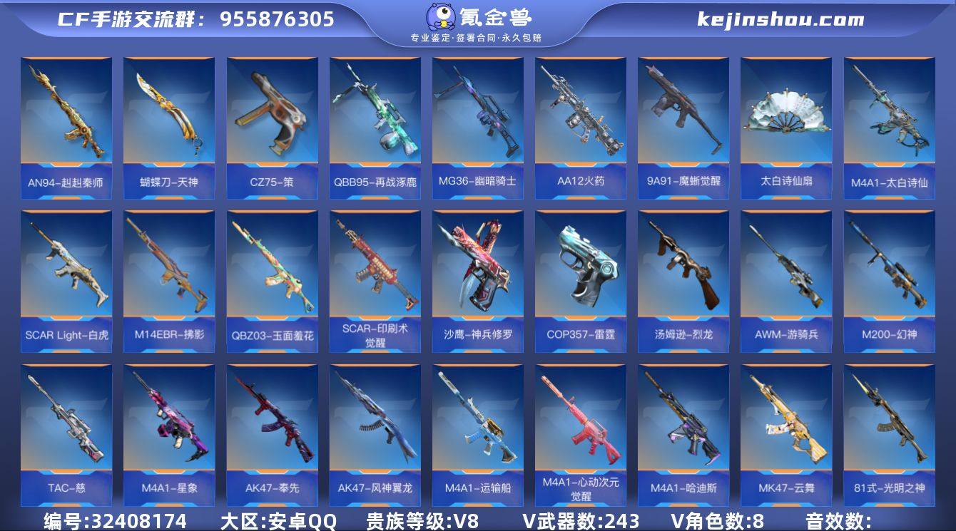 001FQ:F174苹果QQCFM;《可二次》;【精品v8号子】连体304皮肤5典藏3珍品12传说详细看图!!!【153v 28角色 357万化】王者之心,王者之势,王者之力,王者之神,王者之狱,王者之烈,王者之蝶,王者之迹,王者之锋,M4A1-雷霆王者,M4A1-星象,M200-幻神,81式-光明之神,COP 357-堕天神,COP 357-雷霆,AK47-火麒麟,AK47-变色龙,AK47-无影,AK47-天使,AK47-机械迷城,AK47-黑武士觉醒,M4A1-游骑兵,M4A1-堕天神,M4A1-竞界荣光,M4A1-冰锋觉醒,M4A1-死神,M4A1-黑骑士,M4A1-雷神,巴雷特-极光,巴雷特-毁灭,QBZ03-死神,QBZ03-金色蔷薇,AWM-天使,98K-黑骑士,双持斯泰尔-天使,MK5-极光,KSG-天使,AK47-心动次元觉醒,AK47-猩红传说,AK47-血武士,M4A1-玫瑰精灵,M4A1-破空冰刃,M4A1-龙血,M4A1-运输船,M4A1-猎神,剑齿虎-炫彩,9A91-天神,AN94-超新星,SCAR-幽暗骑士,M14EBR-天神,QBZ03-湮灭,98K-血月,09式狙-天神,AK47-破空冰刃,QBZ03-玉面羞花,MK47-鼓龙,刘易斯-血月,加特林-堡垒,加特林-蟒蛇,斯泰尔-蝴蝶,地狱火,地狱烈炎,CZS2-血月,KSG-极光,汤姆逊-烈龙,9A91-魔蜥觉醒,SCAR Light-白虎,HK416-极光,气手枪-炼狱,USP-机械迷城,沙鹰-明目达聪,沙鹰-修罗,沙鹰-火麒麟,USP-雷暴,QSZ92-天使,龙啸-堕天神,尼泊尔-铜头铁臂,手斧-机械迷城,尼泊尔-机械纪元,双持尼泊尔-变色龙,双截棍-天使,马来剑-毁灭,擎天,斩神刀-雷暴,USP-神罚,双持沙鹰-亚龙,血阳,神罚战斧,屠龙,血月,龙啸,唐刀-大唐荣耀,星芒,斩魔刀,麒麟;详细看图手慢无!!!!