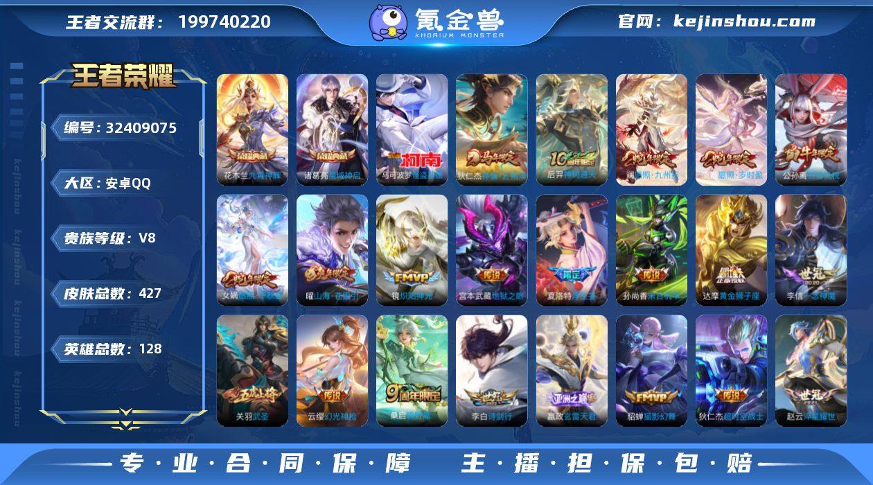 安卓Q-V8-至尊星耀III段位-128英雄-306皮肤-1典藏皮肤-23传说-85史诗【英雄全皮】:孙权全皮,敖隐全皮,蒙恬全皮,赵怀真全皮,戈娅全皮,空空儿全皮,影全皮【荣耀典藏】:吕布千魇归渊【传说皮肤】:杨玉环星之鸣奏,云缨幻光神枪,桑启鸣野蒿,大乔时之奇旅,鲁班七号时之奇旅,夏洛特浮生妄,伽罗炽翼辉光,小乔山海琳琅生,曜山海苍雷引,李信山海炽霜斩,吕布怒海麟威,李白诗剑行,狄仁杰神器狴犴令,不知火舞绯月行,王昭君星穹之声,孙尚香异界灵契,李元芳飞鸢探春,镜炽阳神光,虞姬启明星使,干将莫邪久胜战神,虞姬云霓雀翎,梦奇胖达荣荣,宫本武藏地狱之眼【限定皮肤】:姜子牙天穹之誓,杨戬破阵退雄兵,狄仁杰阴阳师,小乔山海琳琅生,赵云皇家上将,墨子降魔,嬴政优雅恋人,孙尚香异界灵契,鲁班七号时之奇旅,钟无艳超时空战士,孙膑天狼运算者,扁鹊奇幻香踪,元歌无心,甄姬落雪兰心,马可波罗山海玄木吟,狄仁杰魔术师,狄仁杰神器狴犴令,达摩沙漠行僧,项羽海滩派对,王昭君星穹之声,不知火舞绯月行,孙悟空孙行者,李元芳云中旅人,虞姬启明星使,杨戬潮玩骑兵,雅典娜黎明之约,鬼谷子五谷丰年,大乔时之奇旅,苏烈千军破阵,梦奇顽趣,沈梦溪大...