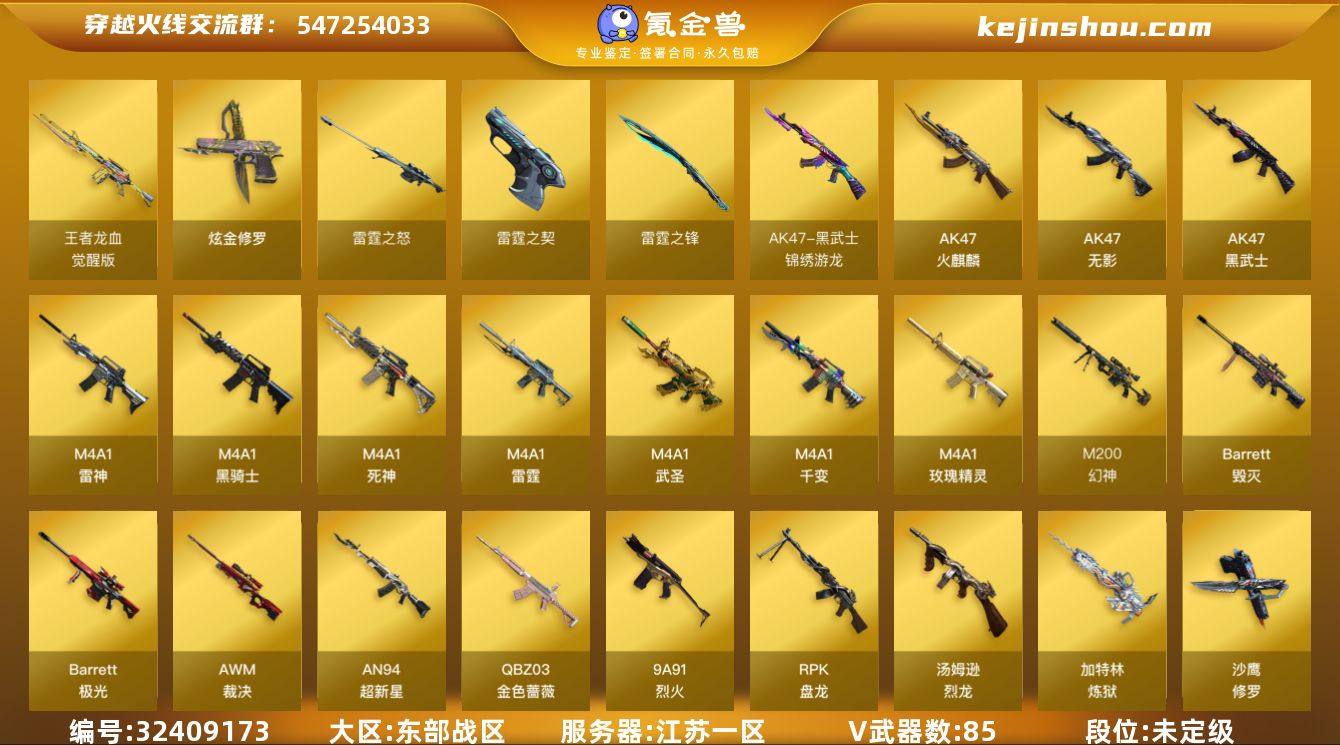 【自带包赔 最高三倍】:东部战区:江苏一区-LV100-等级元帅-段位未定级-85V-2王者-3炫金 【热门武器】:QBZ03-金色蔷薇,M200-幻神,死亡之眼,M4A1-黑骑士*3,汤姆逊-烈龙*2,RPK-盘龙,加特林-炼狱*2,沙鹰-修罗 【王者炫金武器】:炫金骑士,炫金修罗*2 【音效卡】:AK47-火麒麟音效卡,M4A1-雷神音效卡,M4A1-黑骑士音效卡,Barrett-毁灭音效卡 【皮肤】:雷神-暗月,雷神-能量核心,M4A1-战神赵云,雷神-刘备 皮肤,雷神-源计划2.0专属 皮肤,毁灭耀金皮肤,毁灭-星空,毁灭-战神张飞,黑骑士-战神马超,无影-能量核心,天罚-孙权 皮肤,天龙-秘银,极光-能量核心 【角色】:葵,樱,魅影,炫,堕落女神,狐影,修道士,风暴女,娟娟,青霞仙子,蜀雪,影武者-X 【人偶武器】:M37-葵,迷你裂空之翼,夺魂*3,迷你牛牛,迷你巨石泰坦-魔花研究所,灵狐娃娃手雷 【暴走生化】:死亡之眼,超级对讲机 【挑战大师】:激光毁灭者III*2,神圣爆裂者-末日III,阐释者III 【英雄级武器】:M4A1-千变,AK47-火麒麟*3,M4A1-雷神*4,M4A1-黑骑士*3,AK47-无影,M4A1-死神*2,AK47-黑武士*2,AN94-超新星,M4A1-武圣*4,M4A1-雷霆,黑武士-锦绣游龙,M4A1-玫瑰精灵,QBZ0...