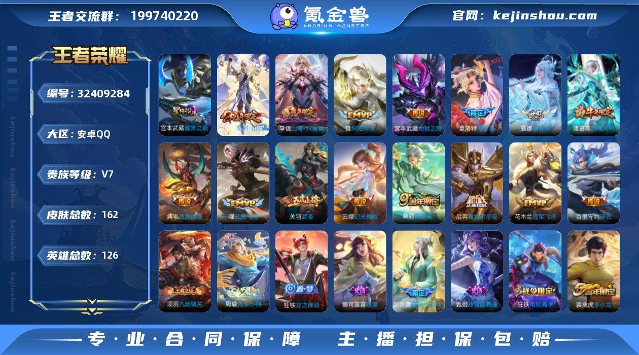 安卓Q-V7-最强王者段位-126英雄-162皮肤-16传说-42史诗【英雄全皮】:敖隐全皮【传说皮肤】:朵莉亚神骥鸣幻洲,司空震愿照山河定,云缨幻光神枪,桑启鸣野蒿,典韦战鼓燎原,露娜霜月吟,夏洛特浮生妄,李信山海炽霜斩,百里守约碎云,诸葛亮时雨天司,镜炽阳神光,关羽武圣,曜云鹰飞将,花木兰冠军飞将,后羿黄金射手座,宫本武藏地狱之眼【限定皮肤】:姜子牙天穹之誓,狄仁杰阴阳师,赵云皇家上将,孙尚香蔷薇恋人,元歌无心,狄仁杰魔术师,项羽海滩派对,关羽武圣,程咬金演武夺筹,王昭君午后时光,李元芳云中旅人,钟馗驱傩正仪,杨玉环遇见飞天,鬼谷子五谷丰年,诸葛亮时雨天司,百里玄策原初追逐者,沈梦溪大漠名商,裴擒虎李小龙,裴擒虎擒涛扼浪,狂铁电玩高手,李信山海炽霜斩,鲁班大师探海日志,桑启海盐诗旅,夏洛特浮生妄,阿古朵江河有灵,张良古海寻踪,蒙犽百解令,鬼谷子天穹祈灯,沈梦溪龙舞盛年,刘邦剑破天穹【年限皮肤】:诸葛亮时雨天司,李信山海炽霜斩,司空震愿照山河定【赛季限定】:程咬金演武夺筹,钟馗驱傩正仪,沈梦溪大漠名商,李元芳云中旅人,桑启海盐诗旅,裴擒虎擒涛扼浪,鲁班大师探海日志,张良古海寻踪,鬼谷子天穹祈灯,刘邦剑...