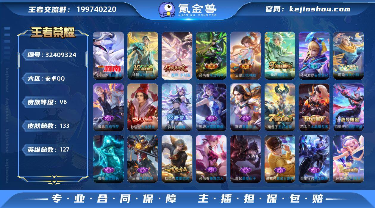 贵族6/皮肤133/传说6/史诗34/英雄127/孙权全皮/影全皮/怪盗基德/纵目迁山/愿照·岁时盈/幻光神枪/鸣野蒿/妄想实况/末日机甲-孙尚香/狰(s8)/阴阳师/皇家上将/蔷薇恋人/重明(s11)/朔风刀(s17)/烛龙(s10)/穷奇(s12)/魔术师/沙漠行僧(s26)/海滩派对/醍醐杖(s20)/演武夺筹(s23)/大圣娶亲/御旌(s15)/云中旅人(s29)/驱傩正仪(s24)/饕餮(s9)/原初探秘者(s21)/五谷丰年/混沌棋(s18)/疑决卦(s19)/擒涛扼浪(s31)/御狮(s13)/御霄(s14)/御銮(s16)/探海日志(s32)/海盐诗旅(s30)/江河有灵/古海寻踪(s33)/鬼谷子天穹祈灯(S34)/噬灭天穹(s37)/荣光之誓/百相守梦-百里守约/百相守梦-老夫子/茶境仙/访茗客/线条小狗-周瑜/钟馗锁墨魂/百相守梦-黄忠/化蝶舞/奇遇舞章/乐园奇幻夜/鹰眼统帅/节奏热浪/星夜王子/逐浪之夏/特工魅影/冰冠公主/黄金分割率/暗隐猎兽者/缤纷独角兽/水晶猎龙者/乱世虎臣/末日机甲-吕布/幽灵船长/圣诞狂欢/魅力维加斯/水果甜心/鬼剑武藏/偶像歌手/冰雪圆舞曲/圣诞恋歌/紫霞仙子/极光幻客/鹤鸣心笺/径山谋武/布丁狗之约/春野闲踪/玫蓝誓约/景韶洛都/雪境奇遇-西施/魅影绮裳/苍林狼骑/逐霄战戟/雾都夜雨/暗都幽影/朵莉亚金色潮汐/幻泉雾影-海月/危途狂花/缤纷绘卷/圆桌骑士(盾山...