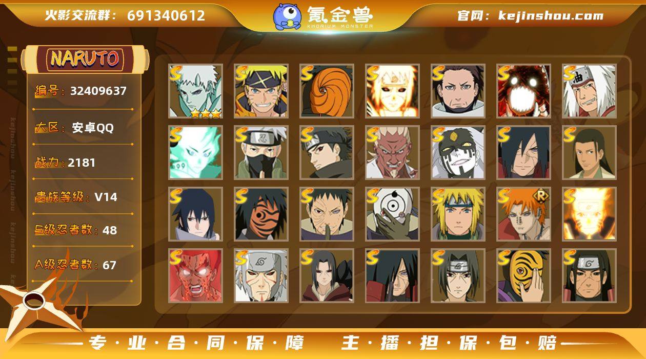 实名:不可二次实名 贵族等级:V12 战力值:21079512 S忍数:43 A忍数:44 五星纲手,五星大蛇丸,四星宇智波鼬「须佐能乎」,四星猿飞日斩,三星漩涡鸣人·宇智波佐助,三星宇智波斑「五影会谈」,三星波风水门「九喇嘛连结」,三星烈斗「初代目风影」,三星漩涡鸣人「暴怒·第六尾」,三星自来也「传说中的三忍」,三星大筒木舍人「最终章」,三星旗木卡卡西「须佐能乎」,三星宇智波止水「须佐能乎」,三星艾「忍界大战」,三星大筒木桃式,三星宇智波斑「秽土转生·解」,三星千手柱间·木叶创立,三星宇智波佐助「永恒万花筒」,三星神秘面具男「红夜之刃」,三星宇智波带土「忍界大战」,三星宇智波斑「白面具」,三星波风水门,三星佩恩·天道「超」,三星漩涡鸣人「九喇嘛连结」,三星迈特凯「死门」,三星千手扉间「秽土转生」,三星宇智波鼬「秽土转生」,三星宇智波斑「秽土转生」,三星千手柱间「秽土转生」,三星千手扉间,三星波风水门「秽土转生」,三星千手柱间,三星猿飞日斩「秽土转生」,三星纲手「百豪」,三星罗砂「四代目风影」,三星宇智波斑「木叶创立」,三星佩恩「天道」,三星自来也,三星大野木「忍界大战」,三星艾「四代目雷影」,三星春野樱「忍界大战」,三星大筒木金式「博人传」,三星自来也「舞之豪杰」 五星蝎,五星干柿鬼鲛,五星猿飞阿斯玛,五星迈特凯,四星飞段,三星我爱罗「疾风传」,二星旗木卡卡西「神威对决」,二星小南「神驹佑将」,二星迈特凯「青春爆炸」,二星巳月「仙人模式」,二星大野木「侠隐江湖」,二星机械鸣人「初始形态」,二星土台「忍界大战」,二星桃地再不斩「秽土转生」,二星神农「羁绊」,二星宇智波带土「漂泊浪客」,二星宇智波泉奈,二星蝎「绯流琥」,二星角都「秽土转生」,二星李洛克「忍界大战」,二星漩涡博人「桃式显现」,二星日向宁次·忍界大战,二星长十郎「六代目水影」,二星宇智波止水,二星长门「青年」,二星佩恩·六道「漂泊浪客」,二星艾「青年」,二星达鲁伊「五代目雷影」,二星波风水门「青年」,二星宇智波佐助「须佐能乎」,二星加藤断,二星迪达拉「秽土转生」,二星漩涡鸣人「九尾查克拉」,二星千代「近松十人卫」,二星我爱罗「忍界大战」,二星秋道丁次「忍界大战」,二星照美冥「五代目水影」,二星漩涡鸣人「仙人模式」,二星飞段「死司凭血」,二星角都,二星小南,二星迪达拉,二星宇智波鼬,二星卑留呼「火之意志继承者」 卖家说:2100w战力全区排名第15,跟前10战力没差多少,还剩下1000多点卷,组织排名第一,60多张高招卷。月卡还有7000金币没取,超影服务还剩79天。