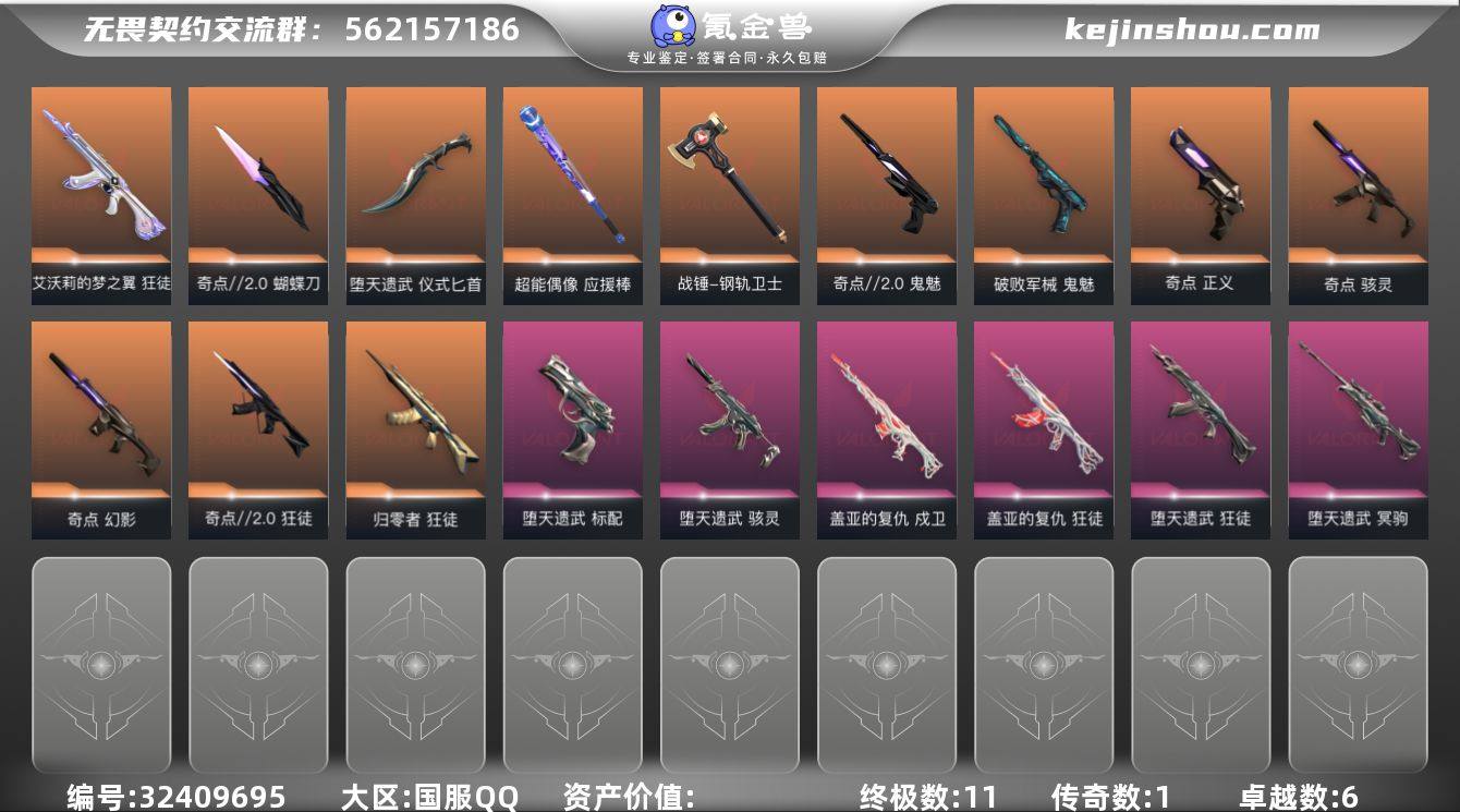 【套装】:奇点//2.0套装,回火礼包:奇点套装,堕天遗武套装 【英雄】:幻棱,炼狱,维斯,暮蝶,钛狐,壹决,铁臂,捷风,雷兹,幽影,不死鸟,贤者,猎枭,蝰蛇,零,芮娜,奇乐,尚勃勒,霓虹,斯凯,夜露,星礈,K/O,海神,盖可,黑梦,钢锁 【近战武器】:近战武器-奇点//2.0 蝴蝶刀,近战武器-超能偶像 应援棒,近战武器-堕天遗武 仪式匕首,近战武器-钢轨卫士 战锤 【狂徒】:狂徒-归零者,狂徒-奇点//2.0,狂徒-艾沃莉的梦之翼,狂徒-堕天遗武,狂徒-盖亚的复仇,狂徒-超能偶像,狂徒-钢轨卫士 【幻影】:幻影-奇点,幻影-聚合之力,幻影-战术小伙伴 【戍卫】:戍卫-盖亚的复仇,戍卫-超能偶像,戍卫-钢轨卫士 【獠犬】:獠犬-采蜜小蜂队,獠犬-战术小伙伴 【冥驹】:冥驹-堕天遗武 【飞将】:飞将-聚合之力,飞将-光导纤维 【战神】:战神-采蜜小蜂队 【奥丁】:奥丁-战术小伙伴 【判官】:判官-超能偶像,判官-采蜜小蜂队 【骇灵】:骇灵-奇点,骇灵-堕天遗武,骇灵-光导纤维 【蜂刺】:蜂刺-聚合之力,蜂刺-战术小伙伴 【标配】:标配-堕天遗武,标配-超能偶像,标配-光导纤维 【正义】:正义-奇点,正义-超限闪存,正义-复古浪潮,正义-纳米打击 【鬼魅】:鬼魅...