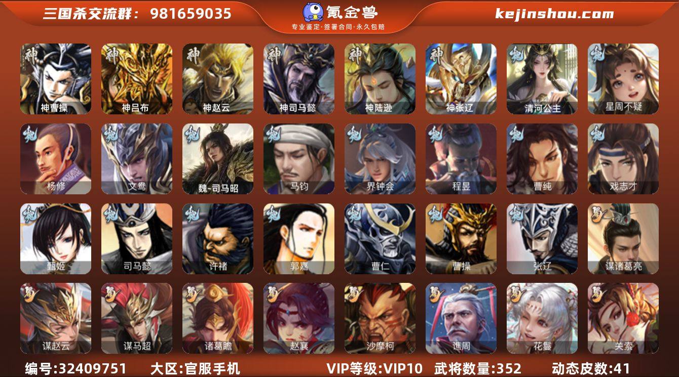 VIP10 大将军 352武将 41动态皮肤 45史诗武将 17宝珠
