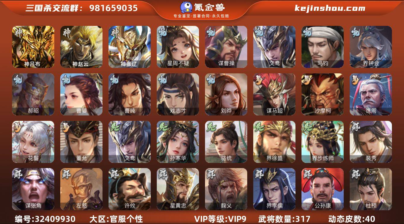 神吕布,神赵云,神张辽,神吕蒙,星周不疑,谋曹操,文鸯,马钧,界钟会,郝昭,曹婴,曹纯,戏志才,刘晔,谋马超,沙摩柯,谯周,花鬘,董允,孙寒华,骆统,界徐盛,界步练师,谋郭嘉,裴秀,左慈,星黄忠,麹义,界李儒,公孙康,杜预,谋张角,张绣,李傕,阎象,许攸,神吕布-监兵噬魅(动态),曹丕-气荡山河(动态),甄姬-明珠耀躯(动态),荀彧-驱虎吞狼(动态),曹婴-兔年春节(动态),曹纯-长坂败备(动态),王元姬-鼠年冬至(动态),羊徽瑜-牛年中秋(动态),刘备-龙御天下(动态),卧龙诸葛-龙跃凤鸣(动态),马超-虎年冬至(动态),诸葛瞻-绵竹之殇(动态),李丰-太仓聚粟(动态),周处-义除三害(动态),孙权-永开吴祚(动态),孙策-虎踞江东(动态),孙寒华-威灵尽显(动态),孙尚香-星流霆击(动态),界孙尚香-星流霆击(动态),徐盛-破军杀将(动态),文鸯-势若万钧(动态),灵雎-霜刃绚练(动态),袁绍-声震寰宇(动态),麹义-扬刀立威(动态),杜预-龙吟破竹(动态),许攸-恃功矜能(动态),李儒-鸠杀少帝(动态),界李儒-鸠杀少帝(动态),SP赵云-...