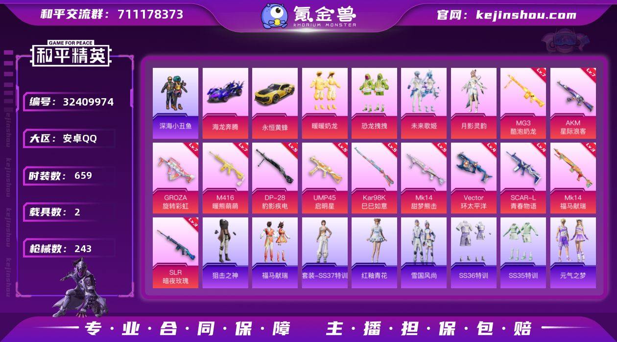 【4粉装-12粉枪-2载具-4珍稀飞行器-179套装-243枪皮】热力值:85332 传奇收藏家:71级 历史最高段位:传奇王牌16星 王牌印记:19 传奇印记:3 卓越印记:6 Lv:76,买和平精英送暗区突围账号