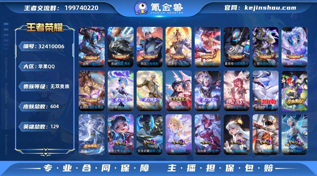 实名: 可修改 性别: 男号 贵族等级: 无双贵族 英雄数: 129 皮肤数: 689 荣耀水晶: 武则天,天鹅之梦,鸣剑·曳影,全息碎影,星域神启,九霄神辉,幻阙歌,弑枪猎影,神鉴启示录,拾光映像 无双皮: 真我赫兹(瑶),神器·明辉仪,碎月剑心,小乔时之魔女,花合斗,离恨烟,雪境奇遇-甄姬,器灵·螭龙剑,无相 珍品传说: 江户川柯南,怪盗基德,器灵·落星盏,兔狲·蓬尾 传说皮: 黄金狮子座,黄金射手座,冠军飞将,云鹰飞将,绛天战甲,黄金白羊座,猫影幻舞,久胜战神,炽阳神光,一念神魔,云霓雀翎,末日机甲-孙尚香,地狱火,仲夏夜之梦,音你心动-小乔,零号·赤焰,海洋之心,地狱之眼,飞鸢探春,音你心动-周瑜,胖达荣荣,李逍遥,乞巧织情,时之恋人-刘备,游龙清影,淬星耀世,超时空战士-狄仁杰,遇见胡旋,末日机甲-孙策,花朝如约,挚爱之约,挚爱花嫁,无双飞将,音你闪耀,碎云,神器·狴犴令,神器·明辉仪,山海·炽霜斩,山海·琳琅生,山海·苍雷引,炽翼辉光,燃星之曲,画中仙,浮生妄,记忆之芯,灼幽烈阳,妄想实况,妄想奇谈,鹤归松栖(云缨),惊梅引,遇见神鼓,鲁班七号-时之奇旅,大乔-时之奇旅,永恒水手月亮,夜礼服假面,小动物乐团,霜月吟,澜逐花归海,艾琳觅芳踪,琥珀纪元铠,琥珀纪元马超,乘龙·问璇玑,貂蝉曦玄引,黄金天蝎座,朵莉亚心动手记,铠冥王哈迪斯,牧神诗旅,启明星使,玄雷天君,幻光神枪,祥瑞亨通,星之鸣奏,续相思,云诺千山,万灵伏威,神树通天 限定皮: 遇见飞天,李小龙,奔雷神使,祈雪灵祝,游园惊梦,梁祝,御风骁将,云端筑梦师,时雨天司,引擎之心,龙胆,白鹤梁神女,武圣,烈魂,魔法小厨娘,异界灵契-孙尚香,玄嵩,白晶晶,岱宗,天狼溯光者,虎魄,天魔缭乱,神威,蜜橘之夏,幽恒,时之彼端,奇迹圣诞,飞衡,乒乒小将,太华,天狼征服者,逐梦之音,青春决赛季,逐梦之翼,天狼狩猎者,冰霜恋舞曲,天狼运算者,逐梦之星,逐梦之影,热情桑巴,神奇女侠,天狼绘梦者,凤求凰,寅虎·御盾,美猴王,白虎...