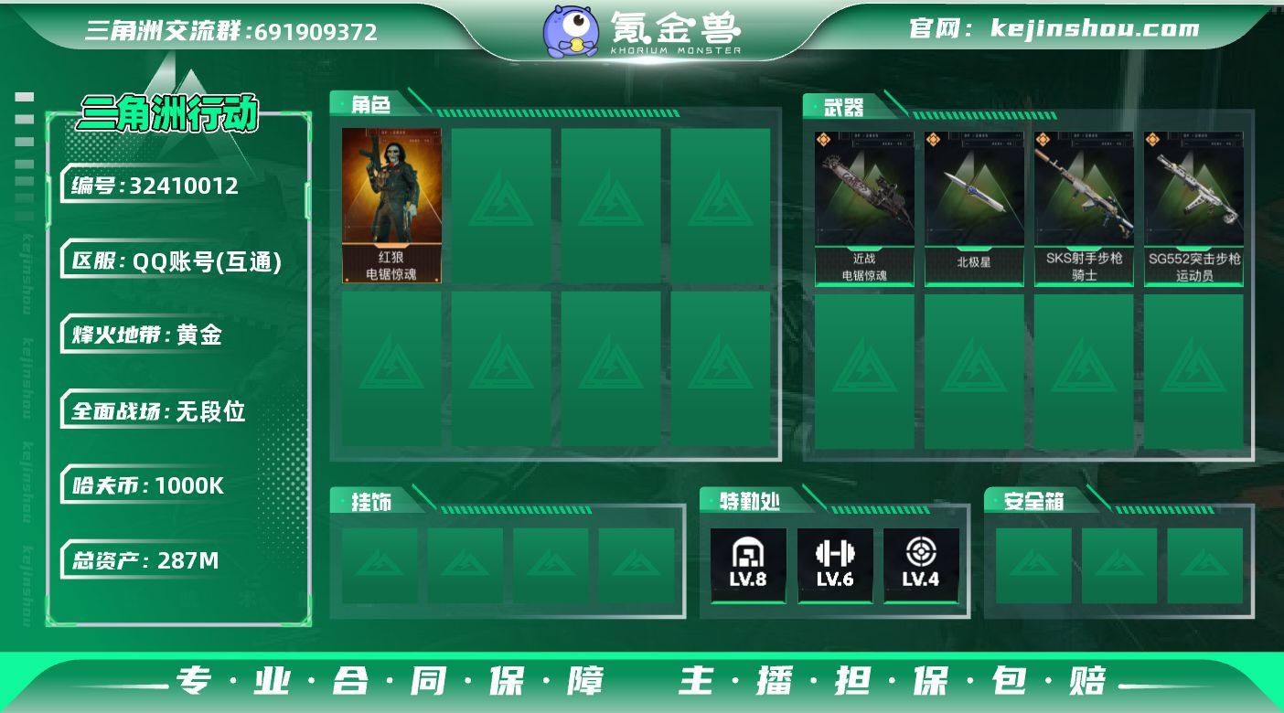QQA39/可二次/QQ区【总资产:287M+aw子弹163发+近战北极星+近战电锯惊魂+红狼电锯惊魂+仓库8】/烽火等级:60级/全面战场:16级/纯币:1000K/三角券加币:297(三角币0+三角券297)【近战-北极星/近战-电锯惊魂】【红狼-电锯惊魂】露娜-金牌射手/部门:22311/特勤等级(技术中心3级/工作台3级/制药台3级/防具台3级/仓库8级/指挥中心5级/训练中心6级/靶场4级/收藏室1级)M7战斗步枪-零度协议/SKS射手步枪-骑士/SG552突击步枪-运动员/KC37突击步枪-北极星//橙色挂饰x8/段位:黄金II(流动资产:259M)详情看图 ,近战-北极星,近战-电锯惊魂