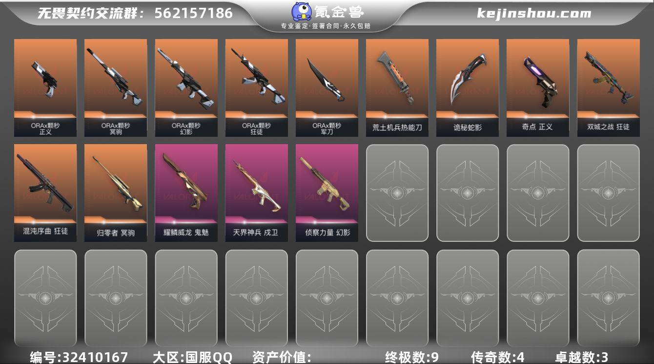 【套装】:ORA x 颗秒套装 【英雄】:幻棱,炼狱,维斯,暮蝶,钛狐,壹决,铁臂,捷风,雷兹,幽影,不死鸟,贤者,猎枭,蝰蛇,零,芮娜,奇乐,尚勃勒,霓虹,斯凯,夜露,星礈,K/O,海神,盖可,黑梦,钢锁 【近战武器】:近战武器-ORA x 颗秒 军刀,近战武器-紫金爪刀,近战武器-威龙之刃,近战武器-荒土机兵 热能刀,近战武器-诡秘蛇影 军刀 【狂徒】:狂徒-混沌序曲,狂徒-双城之战,狂徒-ORA x 颗秒,狂徒-荒土机兵,狂徒-诡秘蛇影 【幻影】:幻影-ORA x 颗秒,幻影-侦察力量,幻影-纳米打击,幻影-末日之翼 【戍卫】:戍卫-天界神兵,戍卫-逆冲蛮牛,戍卫-折光棱晶 【獠犬】:獠犬-逆冲蛮牛 【冥驹】:冥驹-归零者,冥驹-ORA x 颗秒,冥驹-荒土机兵 【飞将】:飞将-末日之翼 【莽侠】:莽侠-诡秘蛇影 【奥丁】:奥丁-纳米打击,奥丁-末日之翼 【判官】:判官-诡秘蛇影,判官-纳米打击x 【雄鹿】:雄鹿-逆冲蛮牛 【骇灵】:骇灵-荒土机兵,骇灵-无限竞技 【蜂刺】:蜂刺-折光棱晶 【标配】:标配-荒土机兵,标配-折光棱晶 【正义】:正义-奇点,正义-ORA x 颗秒,正义-纳米打击 【鬼魅】:鬼魅-耀鳞威龙,鬼魅-诡秘蛇影,鬼魅-星云暗涌 【狂怒】:狂怒-逆冲蛮牛 【短...