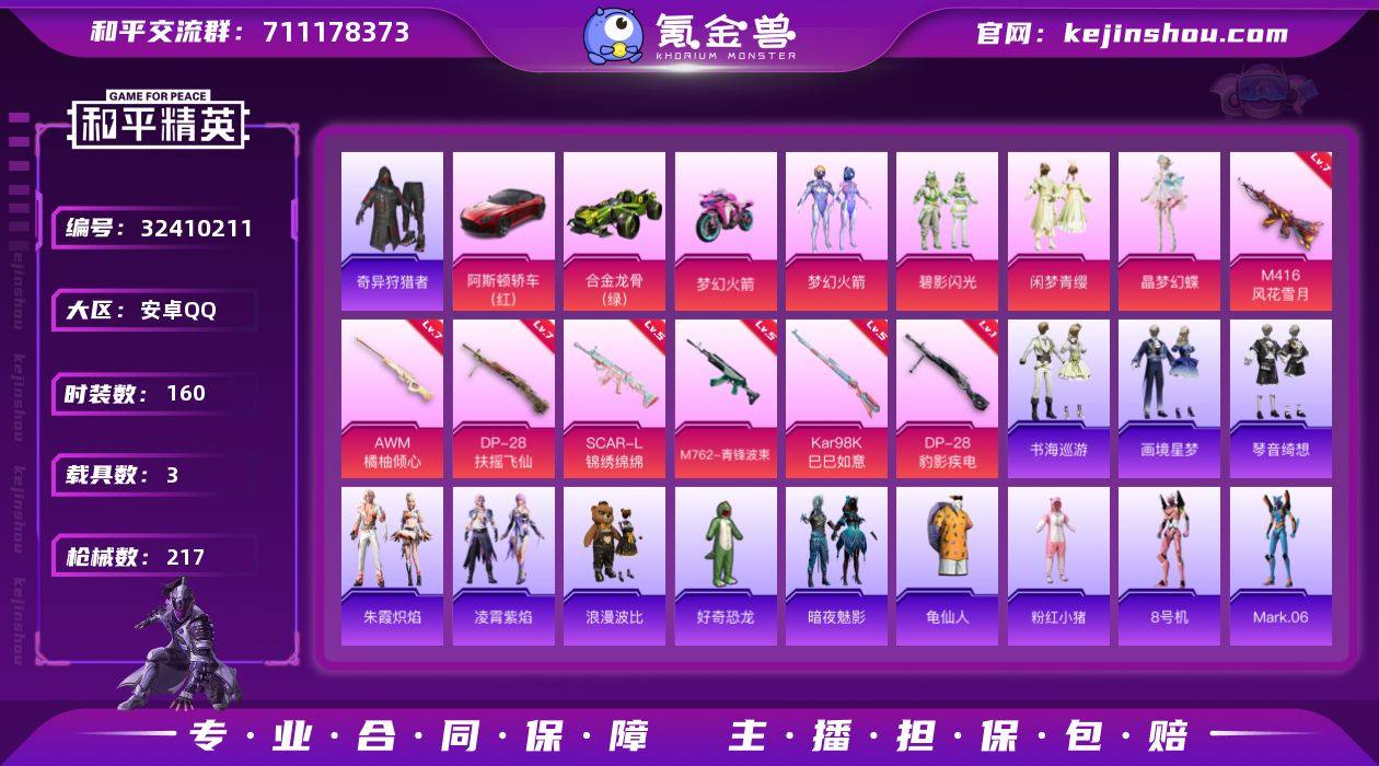 【kyhp662】安卓 手Q-5粉装-7特效枪-3载具-5粉色飞行器-68789热力值-15王牌印记-160套装-217枪皮 【热门品类】:粉装-梦幻火箭,套装-奇异狩猎者,套装-龟仙人,套装-浪漫波比,套装-粉红小猪,角色-8号机,角色-Mark.06 【粉色套装】:粉装-梦幻火箭,粉装-碧影闪光,粉装-闲梦青缨,角色-晶梦幻蝶,角色-罪夜之冕 【粉色枪皮等级】:SCAR-L-锦绣绵绵(五级),M416-风花雪月(七级),M762-青锋波束(五级),Kar98K-巳巳如意(五级),AWM-橘柚倾心(七级),DP-28-扶摇飞仙(七级),DP-28-豹影疾电(一级) 【粉色载具】:阿斯顿马丁DBS(红),合金龙骨(绿),双人摩托-梦幻火箭 【粉色枪皮】:SCAR-L-锦绣绵绵,M416-风花雪月,M762-青锋波束,Kar98K-巳巳如意,AWM-橘柚倾心,DP-28-扶摇飞仙,DP-28-豹影疾电 【粉色飞行器】:炫彩糖果飞行器,梦幻火箭飞行器,星之彼岸飞行器,幻梦之森飞行器,极意拳锋飞行器 【粉色降落伞】:梦幻火箭降落伞,炫紫旋律降落伞,神秘黑猫降落伞,香水柠檬降落伞,相思残雪降落伞,洛神天依降落伞,垂柳戏鸭降落伞,旋转彩虹降落伞,初号机 觉醒Ver.降落伞,月影灵韵降落伞,晶梦幻蝶降落伞,炫彩糖果降落伞 【稀有套装】:套装-龟仙人,套装-巳巳...