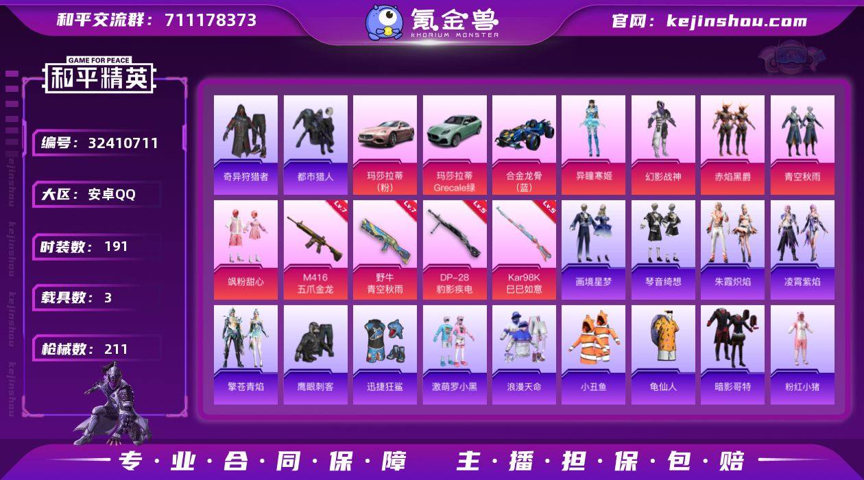安卓【素材号 M416-五爪金龙(七级)/都市猎人/暗影哥特/浪漫天命/野牛-青空秋雨(七级)/玛莎拉蒂Ghibli(粉)】 手Q-5粉装-7特效枪-3载具-1粉色飞行器-69935热力值-12王牌印记-191套装-211枪皮 【热门品类】:套装-浪漫天命,套装-都市猎人,套装-小丑鱼,套装-奇异狩猎者,套装-龟仙人,套装-暗影哥特,套装-粉红小猪 【粉色套装】:粉装-幻影战神,粉装-赤焰黑爵,粉装-青空秋雨,粉装-飒粉甜心,角色-异瞳寒姬 【粉色枪皮等级】:M416-五爪金龙(七级),野牛-青空秋雨(七级),AKS-74U-森灵之息(五级),Kar98K-巳巳如意(五级),Mk14-福马献瑞(五级),AA12-G-萌骑幻想(五级),DP-28-豹影疾电(五级) 【粉色载具】:玛莎拉蒂Ghibli(粉),玛莎拉蒂Grecale(薄荷绿),合金龙骨(蓝) 【粉色枪皮】:M416-五爪金龙,野牛-青空秋雨,AKS-74U-森灵之息,Kar98K-巳巳如意,Mk14-福马献瑞,AA12-G-萌骑幻想,DP-28-豹影疾电 【粉色飞行器】:炫彩糖果飞行器 【粉色降落伞】:绝对恒星降落伞,甜蜜誓约降落伞,星之彼岸降落伞,暗夜玫瑰降落伞,恐龙拽拽降落伞,橘柚倾心降落伞,冷魅冰骑降落伞,筑梦精灵降落伞,炙焰牛王降落伞,青空秋雨降落伞,未来歌姬降落伞,炫光之旅降落伞,异...