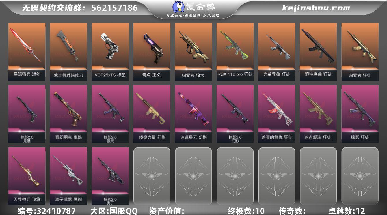 【套装】:掠影//2.0套装【英雄】:幻棱,炼狱,维斯,暮蝶,钛狐,壹决,铁臂,捷风,雷兹,幽影,不死鸟,贤者,猎枭,蝰蛇,零,芮娜,奇乐,尚勃勒,霓虹,斯凯,夜露,星礈,K/O,海神,盖可,黑梦,钢锁【近战武器】:近战武器-影钩,近战武器-剥皮小刀,近战武器-威龙之刃,近战武器-阿特拉斯指挥部 甩棍【狂徒】:狂徒-洪荒怒焰,狂徒-塑水宗,狂徒-创·纪元,狂徒-般若假面//2.0,狂徒-盖亚的复仇【幻影】:幻影-末日泡泡,幻影-般若假面,幻影-掠影//2.0【戍卫】:戍卫-掠影【奥丁】:奥丁-掠影//2.0【骇灵】:骇灵-掠影//2.0【标配】:标配-超能偶像【VCT手枪】:标配-VCT25 x BLG【正义】:正义-西部未来,正义-传奇制造,正义-复古浪潮,正义-游戏结束【鬼魅】:鬼魅-掠影//2.0,鬼魅-流星兵团,鬼魅-诡秘蛇影,鬼魅-扑棱扑棱,鬼魅-宿怨,鬼魅-星云暗涌【狂怒】:狂怒-喷火式【卡面】:《双城之战》拥抱 卡面,精灵大战 卡面,欢迎来到底城 卡面,南瓜盛典 卡面,VCT CN首冠 卡面,无畏契约:暮蝶 卡面,修车达人 卡面,热舞环节 卡面,正义的化身 卡面,终章:生意人麦宝 卡面,铁之华 卡面,时间到 卡面,最高舞台 卡面,音熊登场 卡面,树懒大作战 卡面,声感...