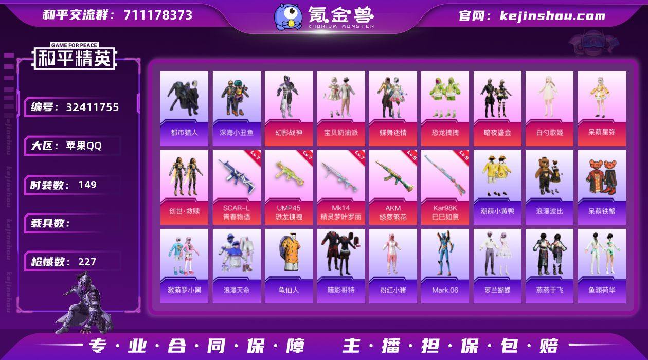 苹果 手Q-【极品身法,素材,小雾神同款,哥特红眼罩,都市猎人,深海小丑鱼,狂沙,金羽头盔全套 恐龙猫包全套,蓝螳螂,】8粉装-5特效枪-0载具-1粉色飞行器-67139热力值-13王牌印记-149套装-227枪皮 【热门品类】:套装-浪漫天命,套装-都市猎人,套装-深海小丑鱼,套装-龟仙人,套装-潮萌小黄鸭,套装-暗影哥特,套装-浪漫波比,套装-粉红小猪,角色-Mark.06 【粉色套装】:粉装-幻影战神,粉装-宝贝奶油派,粉装-蝶舞迷情,粉装-恐龙拽拽,粉装-暗夜鎏金,角色-白勺歌姬,角色-呆萌星弥,套装-创世·救赎 【粉色枪皮等级】:AKM-绿萝繁花(五级),SCAR-L-青春物语(七级),UMP45-恐龙拽拽(七级),Kar98K-巳巳如意(五级),Mk14-精灵梦叶罗丽(七级) 【粉色枪皮】:AKM-绿萝繁花,SCAR-L-青春物语,UMP45-恐龙拽拽,Kar98K-巳巳如意,Mk14-精灵梦叶罗丽 【粉色飞行器】:春暖花开飞行器 【粉色降落伞】:幻影战神降落伞,春暖花开降落伞,洛神天依降落伞,恐龙拽拽降落伞,橘柚倾心降落伞,星夜魔法师降落伞,垂柳戏鸭降落伞,甜蜜草莓降落伞,千面幻镜降落伞,白勺歌姬降落伞,炫光之旅降落伞,蜜语绒猫降落伞,江南烟雨降落伞,初号机 觉醒Ver.降落伞,鬼刀降落伞,无垠阁降落...