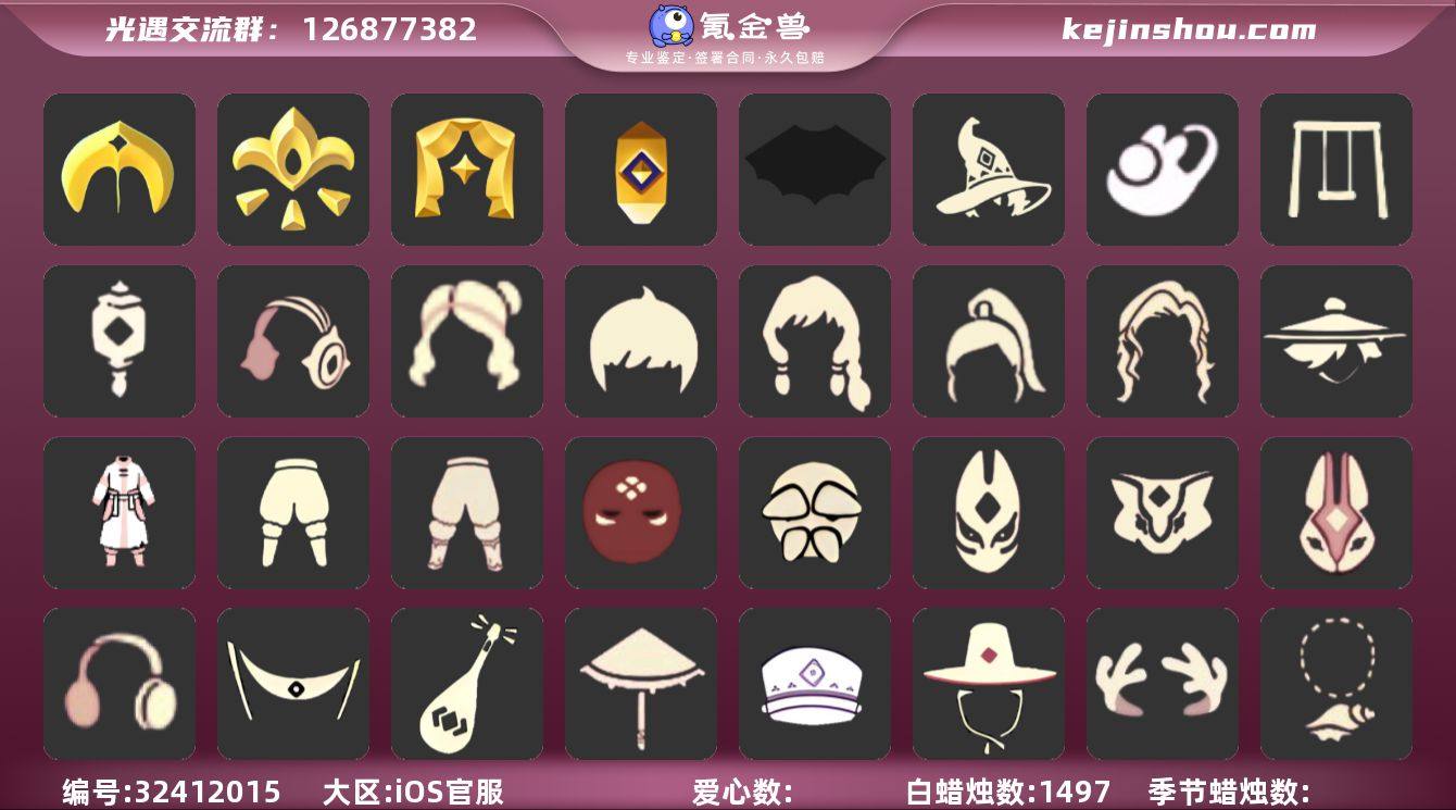 "4季圣岛白枭鲲灯蝙蝠斗兔兔拖鞋秋千多礼多复刻多资源 编号: 区服:苹果 翼数量:141 资源:蜡烛:1497 爱心:83 红蜡烛:28 季卡数:10 已毕业地图: 晨岛 云野 雨林 霞谷 暮土 禁阁 毕业季节:圣岛季 集结季 表演季 追忆季 热门礼包:玉兔拖鞋 保暖雪人靴 祥云服饰 巫师帽 宝骏丹心 蝴蝶与花 大桔大利 雪花发夹 玉兔头饰 绿绒卷耳 金鳞耳坠 圣诞鹿角 彩虹耳机 TGC 王子围巾 白雪斗篷 蝙蝠斗 蝙蝠套装 青衫落拓套装 粽叶斗篷 祥云伞 中秋灯笼 秋千 花憩茶桌 冥龙南瓜 阔腿牛仔裤 热门活动复刻:褴褛长衫 海洋武士裤 彩虹链带裤 沙滩短裤 白色棉裤 毛靴棉裤 绒边棉裤 灯笼棉裤 雪人裤 过膝长袍 红狐狸面具 黄鼠狼面具 老爷爷面具 红兔面具 星绘面具 草叶面具 贴花面具 修行面巾 毛绒领子 海螺项链 海龟肩饰 宴会围巾 圣诞领结 玉兔尾巴 公主 书虫 总裁 地中海 正太 高马尾 明制帽 郡主 箬笠 花环 虚荣 平顶帽 圆环发辫 帝企鹅发 樱花发型 女巫发型 飞鸟发饰 珊瑚发饰 红耳机 断角发饰 红金斗篷 黑金斗篷 白金斗篷 羽翼斗篷 蝴蝶斗篷 单边围巾 樱花斗篷 绿芽斗篷 海浪斗篷 鱼纹斗篷 彩虹斗篷 圣诞斗篷 蓝色长笛 琵琶 雨伞 吊床 星星灯 "
