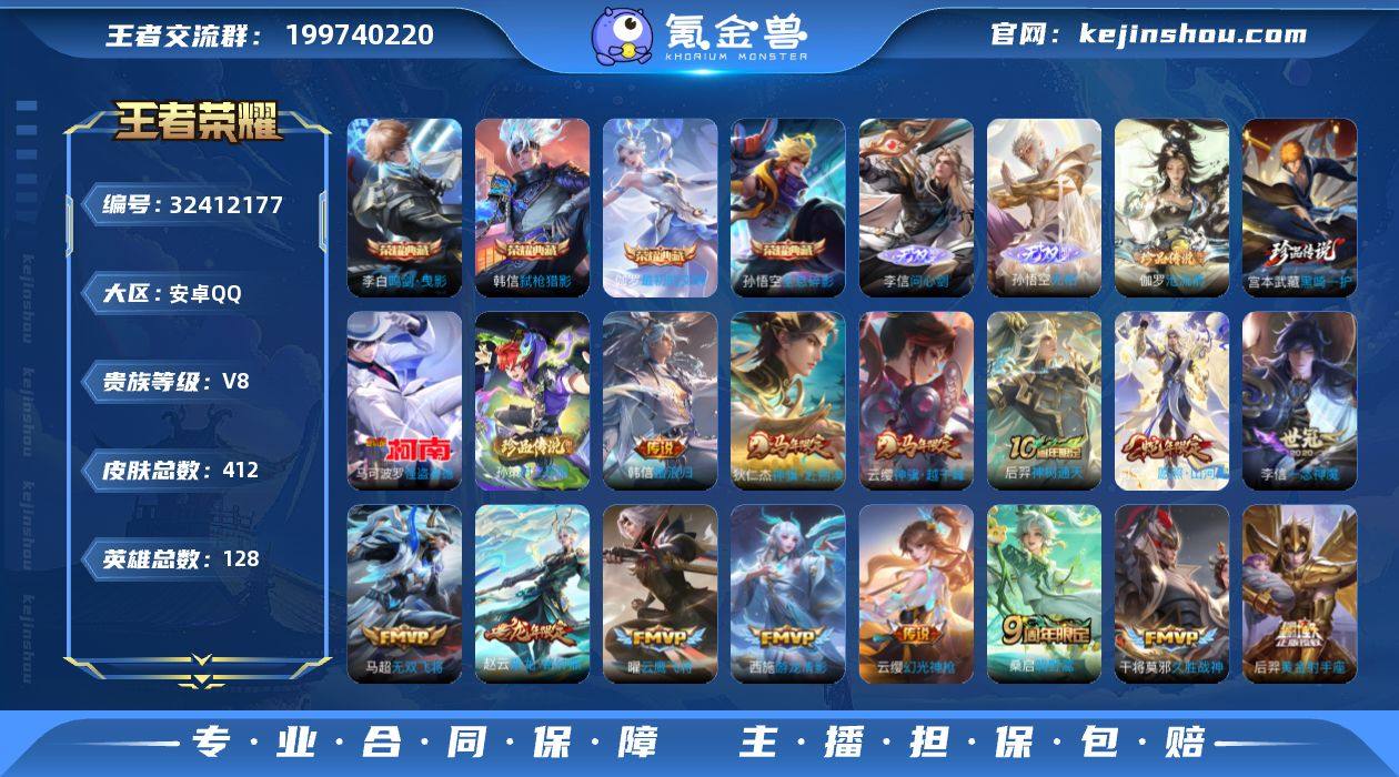 【v8 412皮 5典藏 小兵 伽罗 韩信 李白 孙悟空 2无双 李信 孙悟空 4珍品传说 伽罗 宫本武藏 孙策 马可波罗 22传说 1星传说】实名: 可修改 贵族等级: V8 英雄数: 128 皮肤数: 412 荣耀水晶: 鸣剑·曳影,全息碎影,弑枪猎影,最初的交响 无双皮: 无相,问心剑 珍品传说: 怪盗基德,时之奇旅-孙策,黑崎一护,沧流箭 传说皮: 黄金射手座,云鹰飞将,绛天战甲,黄金白羊座,久胜战神,一念神魔,音你心动-小乔,音你心动-周瑜,时之恋人-刘备,游龙清影,无双飞将,碎云,灼幽烈阳,乘龙·铭钟鼎,幻光神枪,神树通天,神骥·赴朔漠,神骥·越千峰,踏浪归 限定皮: 遇见飞天,李小龙,梁祝,烈魂,辉光之辰,幽恒,奇迹圣诞,大圣娶亲,高山流水,孙行者,猪悟能,傲雪梅枪,五谷丰年,鸣野蒿,逐霄战戟,愿照·山河定