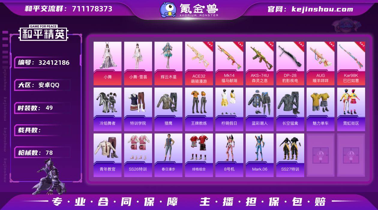 可二次【蓝粉螳螂满级暖羊AUG 3粉装6特效枪 可秒换绑不用等】 安卓Q区-18486热力值-49套装-78枪皮 【2稀有】 8号机 Mark.06【3粉装】 人物-小舞·灵珑 人物-小舞·雪昙 辉云木星【6特效枪】 Mk14-福马献瑞(5级) AKS-74U-森灵之息(5级) ACE32-萌骑漫游(2级) Kar98K-巳巳如意(5级) DP-28-豹影疾电(1级) AUG-暖羊咩咩(5级)【7热门】 霓虹街区 SS27特训 SS26特训 Mark.06 8号机 DBS-彩虹符号 MG3-幻世战舞者【1飞行器】 炫彩糖果飞行器 营地ID:976882416