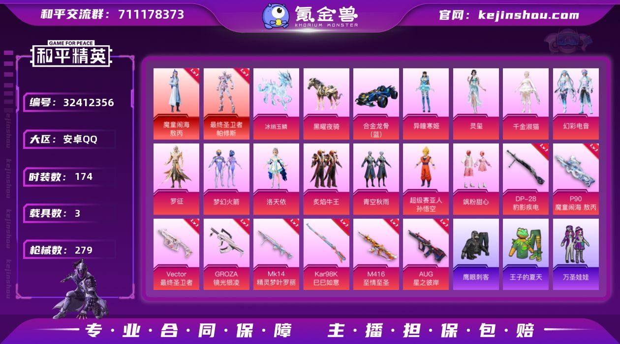 安卓 手Q-17粉装-3特效枪-11载具-6粉色飞行器-64472热力值-3王牌印记-119套装-142枪皮 【热门品类】:粉装-梦幻火箭,粉装-童趣迷兔,套装-SS1特训,套装-龟仙人 【粉色套装】:粉装-蝶舞迷情,粉装-梦幻火箭,粉装-新星烈龙,粉装-童趣迷兔,粉装-彩虹鹿灵,粉装-山涧鹿灵,角色-洛天依,粉装-俏雪含霜,粉装-红伞翩翩,粉装-黄伞悠悠,粉装-黑伞漫漫,粉装-蓝莓炮弹,粉装-绚金瑰梦,粉装-天之羽翼,粉装-焦糖拿铁,粉装-岚岚物语,粉装-紫电风暴 【粉色枪皮等级】:M416-风花雪月(四级),Vector-环太平洋(四级),MG3-洛神天依(四级) 【粉色载具】:特斯拉Roadster(水滴蓝),兰博基尼Aventador SVJ(翡翠绿),兰博基尼Estoque(银翼灰),兰博基尼URUS(明艳黄),路特斯ELETRE(花绽灰),合金龙骨(绿),海龙奔腾,双人摩托-梦幻火箭,双人摩托-双刃魅影(绿),极速兔兔车,空客H135-蔚蓝之翼,快艇-塞莎KL27(深潜蓝) 【粉色枪皮】:M416-风花雪月,Vector-环太平洋,MG3-洛神天依 【粉色飞行器】:春暖花开飞行器,梦幻火箭飞行器,林间仙鹿飞行器,齐天大圣飞行器,风花雪月飞行器,天之羽翼飞行器 【粉色降落伞】:春暖花开降落伞,梦幻火箭降落伞,神秘黑猫降落伞,甜蜜誓约降落伞,夏日绵绵冰降落伞,激战未来降落伞,焰龙焚天降落伞,暗夜玫瑰降落伞,林间仙鹿降落伞,洛神天依降落伞,风花雪月降落伞,绚金瑰梦降落伞,甜心娃娃降落伞,天之羽翼降落伞,焦糖拿铁降落伞,旋转彩虹降落伞 【稀有套装】:套装-龟仙人 【稀有枪皮】:AKM-墨染幽兰,AKM-夜灯,AKM-彩虹符号,AKM-春暖花开,AKM-海渊国主,AKM-环太平洋,AKM-生命誓言,AKM-破晓战魂,AKM-萌趣颜团子,AKM-虎虎生威,M16A4-幻世战舞者,M16A4-甜心亚梦,M16A4-生命誓言,M16A4-红色方程式,M16A4-蓝色火焰,SCAR-L-暗夜玫瑰,SCAR-L-...