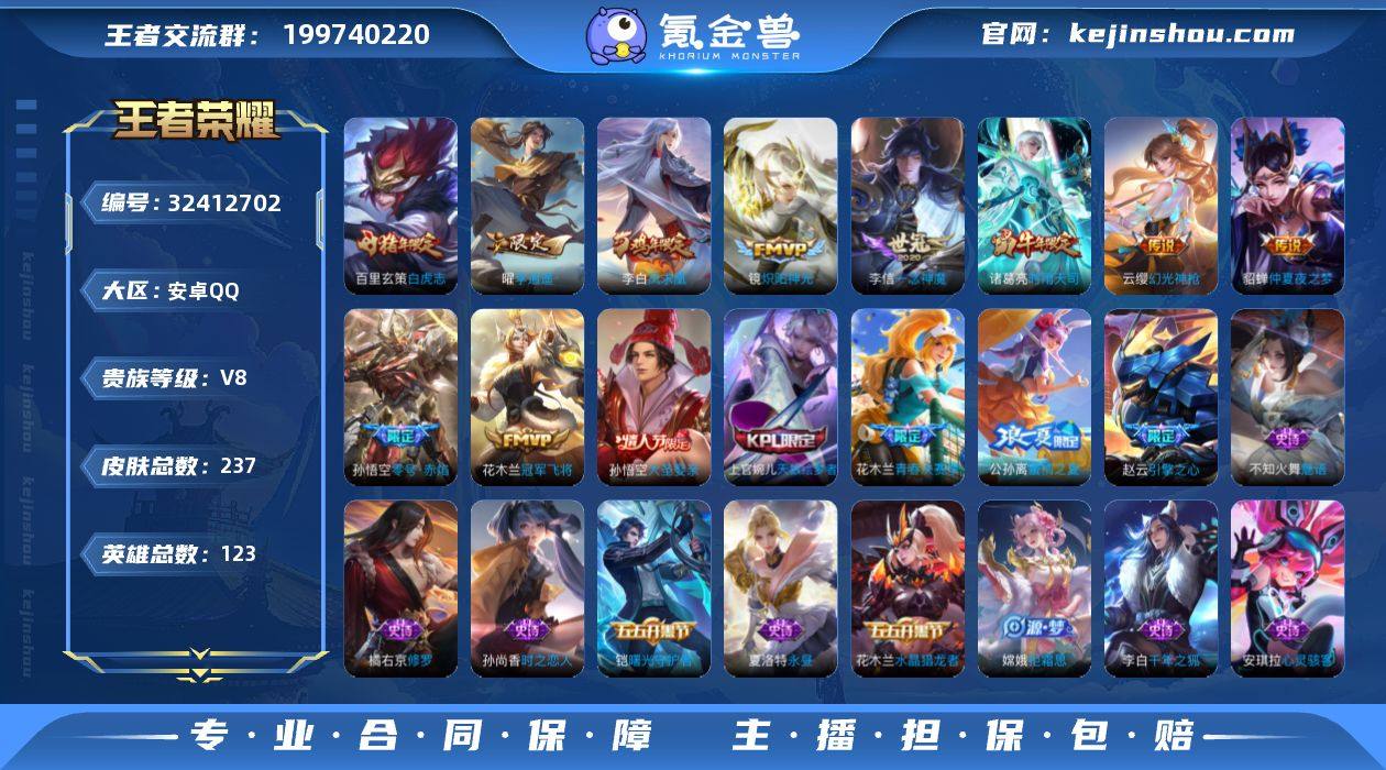 【特价出售】【永久包售后!!!】安卓Q-V8-至尊星耀IV段位-127英雄-199皮肤-1典藏皮肤-1典藏英雄-17传说-53史诗 【英雄全皮】:影全皮 【荣耀典藏】:武则天英雄,关羽赤影疾锋 【传说皮肤】:关羽神骥镇沧海,赵云乘龙铭钟鼎,张飞百相守梦,孙悟空齐天大圣,曜山海苍雷引,后羿无尽星芒,诸葛亮时雨天司,虞姬启明星使,关羽武圣,曜云鹰飞将,李信一念神魔,干将莫邪久胜战神,花木兰冠军飞将,李白凤求凰,宫本武藏地狱之眼,孙悟空地狱火,武则天海洋之心 【限定皮肤】:狄仁杰阴阳师,赵云皇家上将,赵云引擎之心,嬴政白昼王子,鲁班七号狮舞东方,高渐离玩趣恶龙,扁鹊奇幻香踪,吕布猎兽之王,周瑜赤莲之焰,元歌无心,夏侯惇朔风刀,典韦蓝屏警告,马可波罗暗影游猎,马可波罗山海玄木吟,狄仁杰魔术师,狄仁杰万华元夜,达摩沙漠行僧,项羽海滩派对,老夫子醍醐杖,关羽冰锋战神,关羽武圣,程咬金演武夺筹,露娜一生所爱,兰陵王驯魔猎人,兰陵王金庭之子,孙悟空大圣娶亲,孙悟空齐天大圣,牛魔御旌,后羿无尽星芒,张飞百相守梦,李元芳银河之约,李元芳云中旅人,虞姬启明星使,钟馗神迹守卫,钟馗驱傩正仪,杨戬潮玩骑兵,女娲朔望之晖,干将莫邪冰霜恋舞曲...