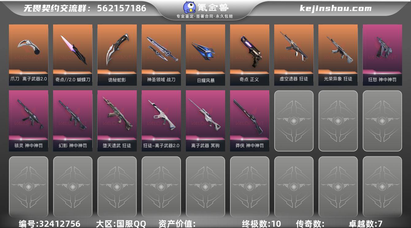 【套装】:神中神罚套装 【英雄】:幻棱,炼狱,维斯,暮蝶,钛狐,壹决,铁臂,捷风,雷兹,幽影,不死鸟,贤者,猎枭,蝰蛇,零,芮娜,奇乐,尚勃勒,霓虹,斯凯,夜露,星礈,K/O,盖可,黑梦,钢锁 【近战武器】:近战武器-神之刃,近战武器-奇点//2.0 蝴蝶刀,近战武器-镭切,近战武器-离子武器//2.0 爪刀,近战武器-诡秘蛇影 军刀,近战武器-神圣领域 战刀,近战武器-日耀风暴 遗器 【狂徒】:狂徒-虚空遗器,狂徒-光荣异象,狂徒-堕天遗武,狂徒-离子武器//2.0,狂徒-诡秘蛇影 【幻影】:幻影-神中神罚,幻影-神圣领域,幻影-末日之翼 【戍卫】:戍卫-月球哨兵,戍卫-折光棱晶 【獠犬】:獠犬-神圣领域 【冥驹】:冥驹-离子武器,冥驹-星云暗涌 【飞将】:飞将-末日之翼 【莽侠】:莽侠-神中神罚,莽侠-诡秘蛇影,莽侠-月球哨兵 【战神】:战神-神圣领域 【奥丁】:奥丁-末日之翼 【判官】:判官-诡秘蛇影 【雄鹿】:雄鹿-月球哨兵 【骇灵】:骇灵-神中神罚,骇灵-无限竞技,骇灵-星云暗涌 【蜂刺】:蜂刺-星云暗涌,蜂刺-折光棱晶 【标配】:标配-艺高胆大,标配-折光棱晶 【正义】:正义-奇点,正义-月球哨兵 【鬼魅】:鬼魅-诡秘蛇影,鬼魅-星云暗涌 【狂怒】:狂...