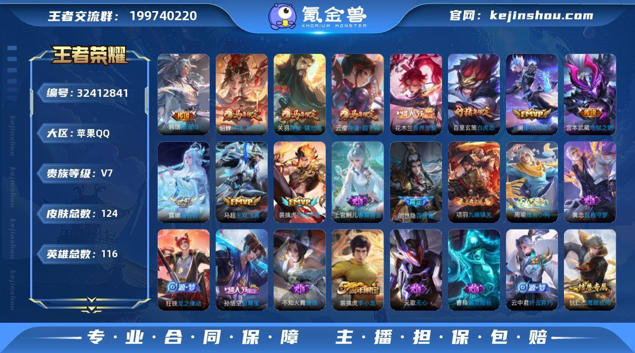 "新皮多!韩信踏浪归!马年云缨!马年关羽!马年貂蝉!花木兰情限!白虎志!裴擒虎fmvp!无双飞将!至尊宝!506玫瑰!2789星币!【高质量野王小号 特价出售 永久包赔】 js1662-苹果Q-V7-最强王者段位-116英雄-124皮肤-11传说-23史诗 【传说皮肤·11】:韩信踏浪归,云缨神骥越千峰,关羽神骥镇沧海,貂蝉神骥聚万邦,花木兰异界灵契,裴擒虎祥瑞亨通,澜逐花归海,露娜霜月吟,马超无双飞将,百里玄策白虎志,宫本武藏地狱之眼 【限定皮肤·21】:狄仁杰阴阳师,赵云皇家上将,孙尚香蔷薇恋人,元歌无心,典韦穷奇,狄仁杰魔术师,狄仁杰万华元夜,项羽海滩派对,老夫子醍醐杖,程咬金演武夺筹,孙悟空至尊宝,牛魔御旌,钟馗驱傩正仪,鬼谷子原初探秘者,百里玄策白虎志,弈星混沌棋,明世隐疑决卦,裴擒虎李小龙,米莱狄御霄,云中君纤云弄巧,盾山御銮 【年限皮肤·1】:百里玄策白虎志 【赛季限定·16】:典韦穷奇,米莱狄御霄,牛魔御旌,盾山御銮,弈星混沌棋,明世隐疑决卦,老夫子醍醐杖,鬼谷子原初探秘者,狄仁杰万华元夜,程咬金演武夺筹,钟馗驱傩正仪,太乙真人谧流熔炉,钟馗虚灵犬护,甄姬逆浪荇歌,亚瑟荣光之誓,项羽九幽镇关 【战令限定·1】:周瑜线条小狗...