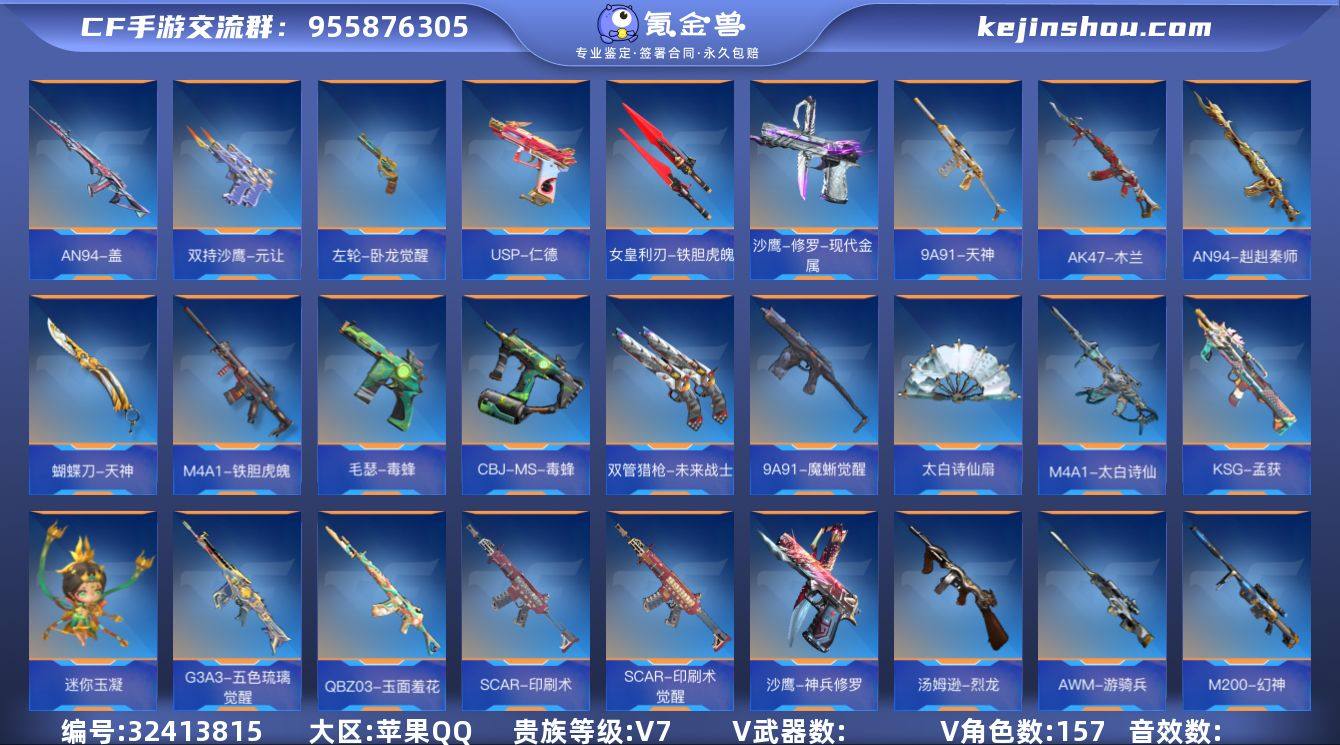 实名: 可修改 v武器数: 143 王者武器数: 8 V/王者角色数量: 7 音效卡数: 7 v武器: MK47-云舞,AK47-血武士,AK47-雷暴,AK47-雷麒麟,AK47-幸运日,AK47-沙漠郡主-超觉,AK47-猩红传说,QBZ03-死神,AK47-黑鲨,M4A1-龙血,AK47-变色龙,QBZ03-金色蔷薇,M4A1-游骑兵-香香,SCAR-幽暗骑士,M4A1-玫瑰精灵,M4A1-死神,M4A1-黑龙,AK47-麒麟,M4A1-雷神,AK47-火麒麟,AK47-无影,M200-心动次元觉醒,M200-心动次元,AWM-天使,M200-幻神,98K-黑骑士,巴雷特-安琪拉,AWM-天龙-曼陀罗,AWM-游骑兵,09式狙-天神,巴雷特-极光,巴雷特-毁灭,AWM-天龙,刘易斯-天使,加特林-堡垒,MK5-极光,双持斯泰尔-天使,汤姆逊-烈龙,KSG-火力竞放,地狱烈炎,地狱火,USP-机械迷城,蟒蛇-火力竞放,MK23-幻神,QSZ92-天使,MK23-机械纪元,沙鹰-修罗-铁骑,USP-神罚,沙鹰--火麒麟,沙鹰-修罗,手斧-机械迷城,丛林匕首-火力竞放,尼泊尔-冰封觉醒,尼泊尔-机械纪元,尼泊尔-雷霆,白骨利刃,血阳,拳魔小巨兽,血月,斩魔刀,星芒,神罚战斧,马来剑-毁灭,耀金雷刃,屠龙,海斯博士双刃-激光,CZ75-穷奇,柯尔特-伏刹山海觉醒,AN94-四凶觉醒,CZS2-血月,QCW05-变形金刚·大黄蜂,改装GLOCK-木兰,QBB95-极光,秋逸,98K-星神,PP19野牛-造纸术,方天画戟,M4A1-猎神,SCAR-探星者,雌雄双股剑,SCAR-印刷术觉醒,M14EBR-拂影,QBZ03-玉面羞花,AK47-轮回,虎贲钩镰刀,气手枪-血月,沙鹰-神兵修罗,M16-恶魔,QBB95-再战涿鹿,蝴蝶刀-天神,AK47-元让,M4A1-夏清,AK47-木兰,M4A1-千变,M4A1-雷暴,P90-突突兔觉醒,蟒蛇-奉先,唐刀-华夏传说,USP-仁德 王者武器: 王者之影,王者之魄,王者之心,王者之魂,COP357-雷霆王者 v角色: 云悠悠,关小雨,瞳,萝拉,蜀雪,蔡文昭 枪械皮肤: AK47-雷麒麟-火锅,M4A1-死神-不屈老兵,巴雷特-毁灭-星空,巴雷特-毁灭-不屈老兵,王者之光-HeartShot,巴雷特-毁灭-能量核心,巴雷特-毁灭-诸神黄昏,巴雷特-极光-重型机甲,巴雷特-毁灭-暗月,AWM-游骑兵-寒霜,AK47-火麒麟-白虎,AK47-火麒麟-ProMax,AK47-火麒麟-钰,M4A1-雷神-星空,M4A1-黑骑士-海王,M4A1-黑龙-暗月,王者之魄-HeartShot,M4A1-雷神-能量核心,M4A1-雷神-千变,M4A1-黑龙-苏城钰,M4A1-雷神-时空幻境,王者之轮-HeartShot,沙鹰-修罗-不屈老兵,改装GLOCK-黑龙-暗月,沙鹰-修罗-紫魇,沙鹰-修罗-诸神黄昏,屠龙-枪圣之锋,蝴蝶刀-极光-锈迹斑斑,丛林匕首-死神-暗月,屠龙-英雄战甲,黑龙刺-暗月,马来剑-毁灭-暗月,龙啸-魔神,COP357-雷霆王者-冰霜奇迹,屠龙-星空,麒麟刺-星空,M4A1-黑骑士-现代金属,M4A1-千变-随变,AK47-无影-暗月,AK47-木兰-霓裳铁骑,AK47-竞界荣光-蜂鸟,战斧-无影-暗月,Origin12-机变奇蛇觉醒-千变 亮点: 幻神,王魄女团皮,多击杀音效,开枪音效