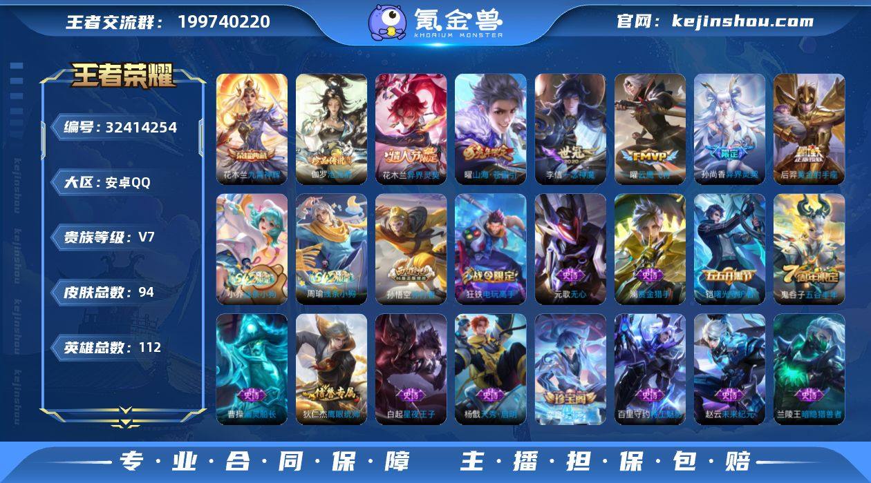 【特价急出/详情看图】安卓Q-V7-至尊星耀V段位-128英雄-252皮肤-1珍品传说-1星元-10传说-61史诗 【英雄全皮】:司空震全皮,影全皮 【珍品传说】:孙策时之奇旅 【传说皮肤】:司空震愿照山河定,澜愿照九州拓,桑启鸣野蒿,马超无双飞将,镜炽阳神光,曜云鹰飞将,刘备时之恋人,花木兰冠军飞将,宫本武藏地狱之眼,孙悟空地狱火 【限定皮肤】:白起狰,姜子牙天穹之誓,狄仁杰阴阳师,虞姬凯尔特女王,赵云皇家上将,高渐离玩趣恶龙,扁鹊奇幻香踪,芈月重明,元歌无心,曹操烛龙,典韦穷奇,狄仁杰魔术师,狄仁杰万华元夜,达摩沙漠行僧,项羽海滩派对,老夫子醍醐杖,程咬金演武夺筹,孙悟空孙行者,李元芳云中旅人,钟馗驱傩正仪,杨玉环遇见飞天,杨戬潮玩骑兵,干将莫邪胡桃夹子,太乙真人饕餮,太乙真人华丽摇滚,鬼谷子原初探秘者,鬼谷子五谷丰年,百里玄策原初追逐者,梦奇顽趣,明世隐疑决卦,裴擒虎李小龙,裴擒虎擒涛扼浪,狂铁御狮,米莱狄御霄,云中君纤云弄巧,盾山御銮,上官婉儿梁祝,嫦娥拒霜思,西施玲珑珍味,鲁班大师探海日志,桑启海盐诗旅,戈娅驭风魔法,艾琳流音漫舞,司空震地狱燃心,阿古朵江河有灵,张良古海寻踪,蒙犽百解令,蒙恬荣光圣徽,高渐离燃音魔法,妲己灵卜魔法,鬼谷子天穹祈灯,鲁班七号蔬乡物语,李元芳蔬乡物语,刘邦剑破天穹,程咬金群星魔术团,周瑜熔金海岸 【年限皮肤】:司空震愿照山河定,澜愿照九州拓 【赛季限定】:虞姬凯尔特女王,白起狰,太乙真人饕餮,曹操烛龙,芈月重明,典韦穷奇,狂铁御狮,米莱狄御霄,盾山御銮,明世隐疑决卦,老夫子醍醐杖,鬼谷子原初探秘者,狄仁杰万华元夜,程咬金演武夺筹,钟馗驱傩正仪,达摩沙漠行僧,李元芳云中旅人,桑启海盐诗旅,裴擒虎擒涛扼浪,鲁班大师探海日志,张良古海寻踪,鬼谷子天穹祈灯,刘邦剑破天穹,姜...