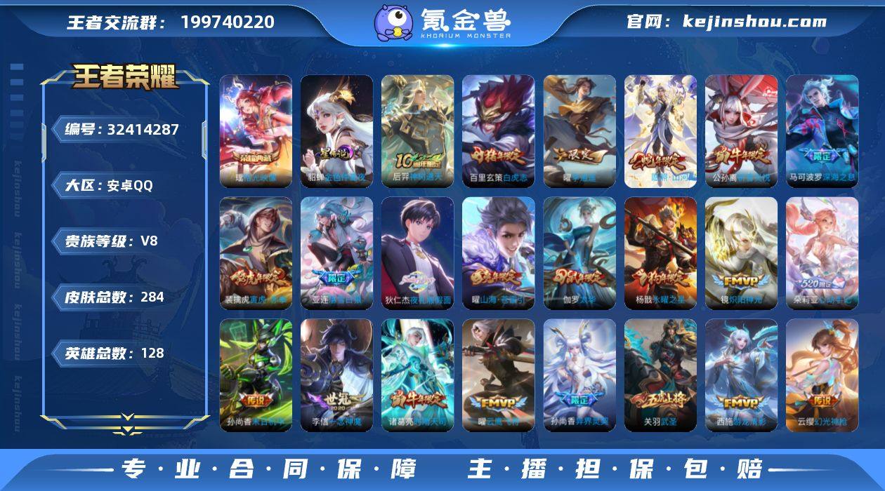 【店主推荐捡漏号!可直接换绑】安卓Q-V8-至尊星耀IV段位-127英雄-382皮肤-3典藏皮肤-1无双-17传说-121史诗-2星元 【英雄全皮】:阿轲全皮,刘邦全皮,孙权全皮,狂铁全皮,戈娅全皮 【荣耀典藏】:李白鸣剑曳影,花木兰九霄神辉,韩信弑枪猎影 【无双皮肤】:诸葛亮天机白泽 【传说皮肤】:后羿神树通天,女娲愿照千秋盛,虞姬愿照岁时盈,云缨幻光神枪,桑启鸣野蒿,马可波罗妄想实况,澜电玩雷克斯,孙策末日机甲,孙尚香异界灵契,赵云淬星耀世,诸葛亮时雨天司,虞姬启明星使,曜云鹰飞将,李信一念神魔,李白凤求凰,宫本武藏地狱之眼,狄仁杰超时空战士 【限定皮肤】:白起狰,蔡文姬夏日便利店,狄仁杰阴阳师,虞姬凯尔特女王,赵云皇家上将,赵云引擎之心,赵云龙胆,赵云百木心枪,墨子神迹守卫,嬴政优雅恋人,嬴政白昼王子,孙尚香蔷薇恋人,孙尚香异界灵契,鲁班七号狮舞东方,庄周高山流水,高渐离死亡摇滚,阿轲迷踪丽影,钟无艳超时空战士,扁鹊炼金王,扁鹊奇幻香踪,芈月重明,芈月幻夜卜梦,吕布猎兽之王,周瑜赤莲之焰,元歌云间偶戏,元歌无心,夏侯惇朔风刀,甄姬游园惊梦,甄姬落雪兰心,曹操烛龙,典韦穷奇,典韦蓝屏警告,马可波罗山海玄木吟,马可波罗妄想实况,狄仁杰魔术师,狄仁杰万华元夜,达摩星际陆战队,达摩沙漠行僧,项羽海滩派对,老夫子醍醐杖,老夫子航海奇遇记,程咬金演武夺筹,露娜一生所爱,刘邦夺宝奇兵,韩信傲雪梅枪,王昭君午后时光,兰陵王驯魔猎人,兰陵王金庭之子,花木兰瑞麟志,亚瑟潮玩骑士王,孙悟空美猴王,孙悟空大圣娶亲,孙悟空孙行者,牛魔御旌,后羿圣弓游侠,李元芳银河之约,李元芳匿光侦查者,李元芳云中旅人,虞姬启明星使,钟馗神迹守卫,钟馗驱傩正仪,杨玉环遇见飞天,杨戬潮玩骑兵,女娲朔望之晖,哪吒逐梦之翼,干将莫邪冰霜恋舞曲,干将莫...