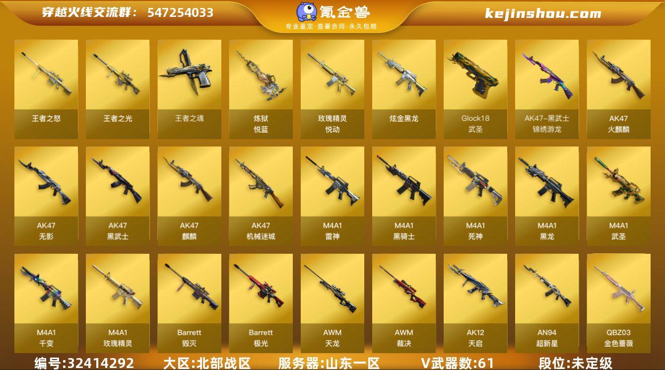山东一区-62V-6王者武器数-1炫金武器数 【热门武器】:QBZ03-金色蔷薇*2,死亡之眼,M4A1-黑骑士,汤姆逊-烈龙*6,RPK-盘龙*2,加特林-炼狱,沙鹰-修罗*8 【王者炫金武器】:玫瑰精灵-悦动,王者之光,王者之怒*2,炼狱-悦蓝,王者之魂,炫金黑龙 【音效卡】:Barrett-毁灭音效卡,炼狱-百战金芒-庆典舞曲音效卡 【皮肤】:雷神-暗月,雷神-能量核心,M4A1-再燃火线,毁灭-暗月*2,毁灭-荣耀之怒,黑龙-能量核心,黑龙-暗月,黑骑士-暗月*2,黑骑士耀金皮肤,无影-暗月,死神-秘银,天龙-能量核心,极光-能量核心*2,修罗-能量核心*3,轻型军用手斧-再燃火线 【角色】:葵,葵-阿尔法武装,空,暗夜-X,芳心审判者,飞虎队-X,风暴女*2,零-水下丽影,灵狐者-X,灵狐者-黄金海岸,麻雀,铁骑荣耀,维纳斯,新娜塔莎,雪莉杨,夜玫瑰-宠粉,影武者-X 【人偶武器】:天龙-曼陀罗,迷你裂空之翼*2,迷你牛牛*2,生化手雷-机甲核心*2 【暴走生化】:异变清道夫,双面神,死亡之眼,超级对讲机 【挑战大师】:神圣爆裂者III,激光毁灭者III-白马银枪,VEPR-12-金魔,激光毁灭者III,机甲撕裂者III,KAC-圣炎切割者III,阐释者III 【英雄级武器】:M4A1-千变,AK47-火麒麟*2,AK47-...