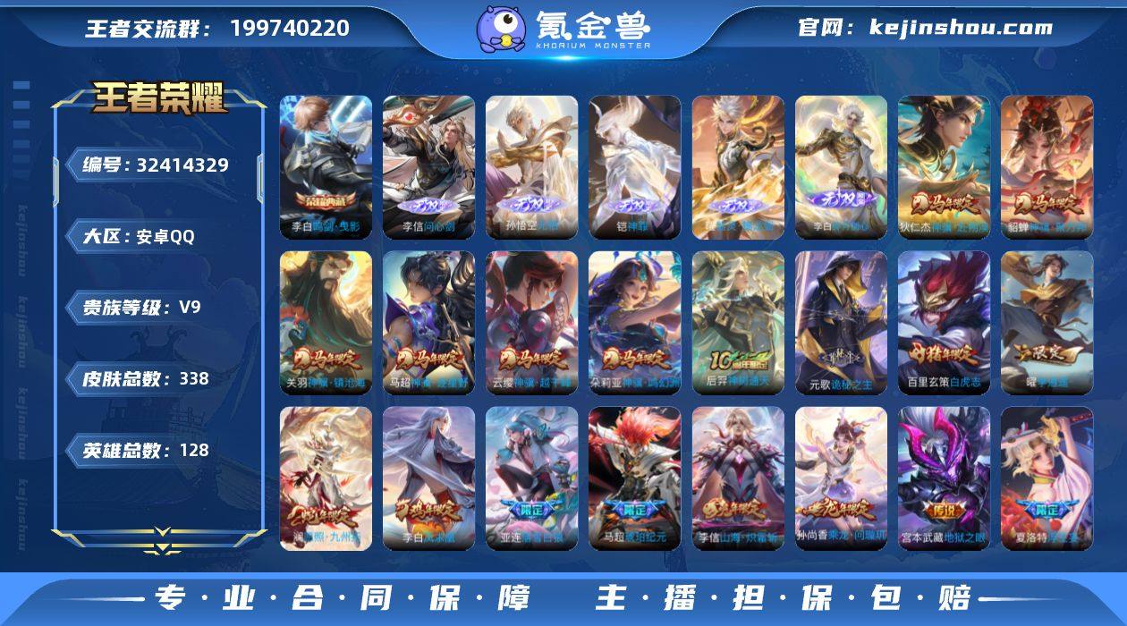 【WZF495】贵族9/皮肤338/典藏1/传说36/史诗80/英雄128/李白全皮/李信全皮/敖隐全皮/夏洛特全皮/空空儿全皮/影全皮/海诺全皮/鸣剑·曳影/李信问心剑/无相/神罪/器灵·螭龙剑/碎月剑心/云缨神骥越千峰/关羽神骥镇沧海/朵莉亚神骥鸣幻洲/狄仁杰神骥赴朔漠/貂蝉神骥聚万邦/马超神骥逐星野/神树通天/诡秘之主/愿照·九州拓/幻光神枪/鸣野蒿/落雪白狼/乘龙·问璇玑/乘龙·铭钟鼎/琥珀纪元马超/琥珀纪元铠/霜月吟/鲁班七号-时之奇旅/鹤羽星尊/记忆之芯/浮生妄/山海·炽霜斩/怒海麟威/诗剑行/无双飞将/李逍遥/启明星使/云鹰飞将/一念神魔/久胜战神/云霓雀翎/黄金狮子座/白虎志/黄金射手座/凤求凰/地狱之眼/埋骨钱/蒙犽顽岩魄/蔡文姬夏日便利店/大乔绒语心约/虞姬夏日便利店/天穹之誓(s36)/谪仙醉月/阴阳师/皇家上将/龙胆/蔷薇恋人/迷踪丽影/超时空战士-钟无艳/猎兽之王/无心/朔风刀(s17)/落雪兰心/魔术师/沙漠行僧(s26)/海滩派对/傲雪梅枪/金庭之子(s27)/至尊宝/孙行者/辉光之辰/云中旅人(s29)/五谷丰年/混沌棋(s18)/疑决卦(s19)/纤云弄巧/拒霜思/玲珑珍味/探海日志(s32)/海盐诗旅(s30)/流音漫舞/鹤归松栖(赵怀真)/地狱燃心/江河有灵/古海寻踪(s33)/百解令(蒙犽)/高渐离燃音魔法/妲己灵卜魔...