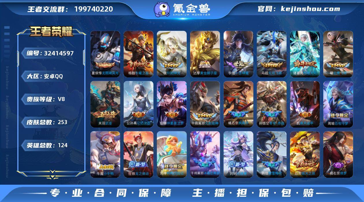 【高性价比·神鉴启示录·韩信群星魔术团·天机白泽·孙策时之奇旅·器灵落星盏·黑崎一护·沧流箭·神骥逐星野·愿照九州拓·千山共赴·浮生妄·炽阳神光·力鸭全场天幕·可二次】w16583-安卓Q-128英雄-248皮肤-11王者印记-270铭文-贵族积分4w【贵族7】【1典藏·2无双·4珍品·2星传说·14传说·1天幕·21按键】【因赛季更新游戏段付以上号为准!】 【英雄全皮】:孙权全皮,狂铁全皮,敖隐全皮,海诺全皮 【荣耀典藏】:虞姬神鉴启示录 【无双皮肤】:韩信群星魔术团,诸葛亮天机白泽 【珍品传说】:孙策时之奇旅,嫦娥器灵落星盏,宫本武藏黑崎一护,伽罗沧流箭 【星元皮肤】:刘备时之思念,宫本武藏幽冥之眼 【天幕】:力鸭全场天幕 【传说皮肤】:马超神骥逐星野,干将莫邪千山共赴,澜愿照九州拓,云缨幻光神枪,亚连落雪白狼,夏洛特浮生妄,王昭君乞巧织情,镜炽阳神光,曜云鹰飞将,刘备时之恋人,达摩黄金狮子座,后羿黄金射手座,宫本武藏地狱之眼,孙悟空地狱火 【限定皮肤】:狄仁杰阴阳师,赵云皇家上将,钟无艳王者之锤,钟无艳超时空战士,白起夜都怪侠,芈月白晶晶,元歌无心,夏侯惇朔风刀,甄姬游园惊梦,甄姬落雪兰心,狄仁杰魔术师,狄仁杰万华元夜,达摩沙漠行僧,项羽海滩...