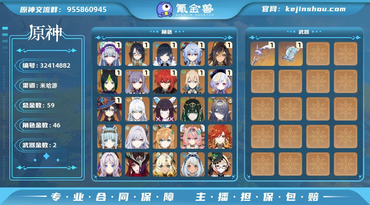 女角色全收集并且满练度的号,五星输出角色有16个双暴分达到或接近220分。号内有205抽纠缠之缘,五星武器有阿莫斯之弓和四风原典。瓦雷莎二命,一命的有:千织、八重神子、甘雨、夜兰、闲云。四星角色齐全,常驻五星角色齐全且都有命座。每个角色至少有两套可替换圣遗物,主角每个属性的都有。 交易成功后绝不找回,有售后问题可咨询。