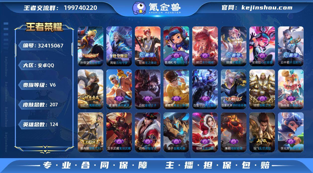键 8印记 1天幕 实名: 可修改 贵族等级: V6 英雄数: 124 皮肤数: 207 荣耀水晶: 全息碎影 限定皮: 李小龙,梁祝,高山流水,孙行者,猪悟能,匿光追影者,五谷丰年,齐天大圣