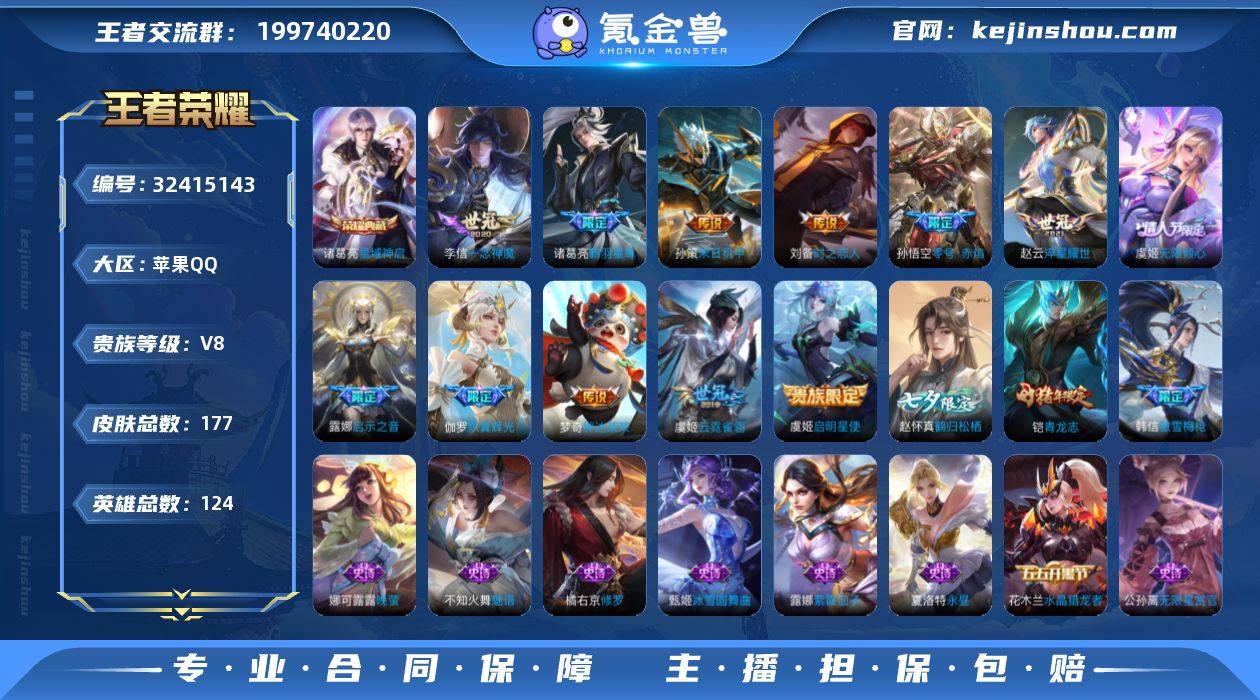 实名: 可修改 贵族等级: V8 英雄数: 124 皮肤数: 177 荣耀水晶: 星域神启 传说皮: 一念神魔,云霓雀翎,零号·赤焰,胖达荣荣,时之恋人-刘备,淬星耀世,末日机甲-孙策,炽翼辉光,鹤羽星尊,启明星使 限定皮: 遇见飞天,梁祝,青龙志,匿光追影者,女儿国国王,傲雪梅枪,启示之音,无限倾心-虞姬