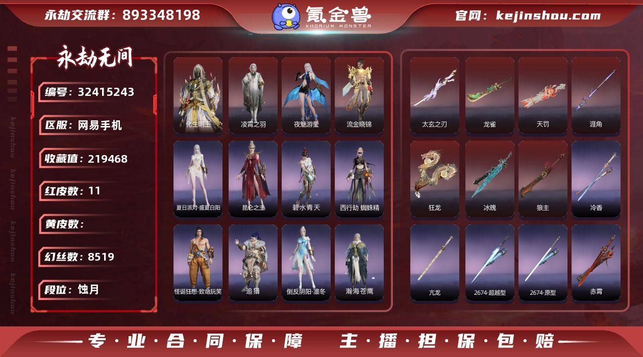【红皮】:凌霄之羽(无尘皮肤),冰魄(长剑皮肤),狼主(阔刀皮肤),狂龙(双节棍皮肤),化生明王(天海皮肤),涯角(枪皮肤),夜魅游莹(季莹莹皮肤),天罚(火炮皮肤),流金晓锦(刘炼皮肤),龙雀(阔刀皮肤),太玄之刃(太刀) 【外观总数】11红 311金 幻丝:金砖: 收藏值:21w 【换绑】:可换绑,期间登录网易大神不影响正常游戏,其他皮肤可参考以下截图,道具、段位以实际验号为准,段位因赛季原因发生变化,以上号为准"