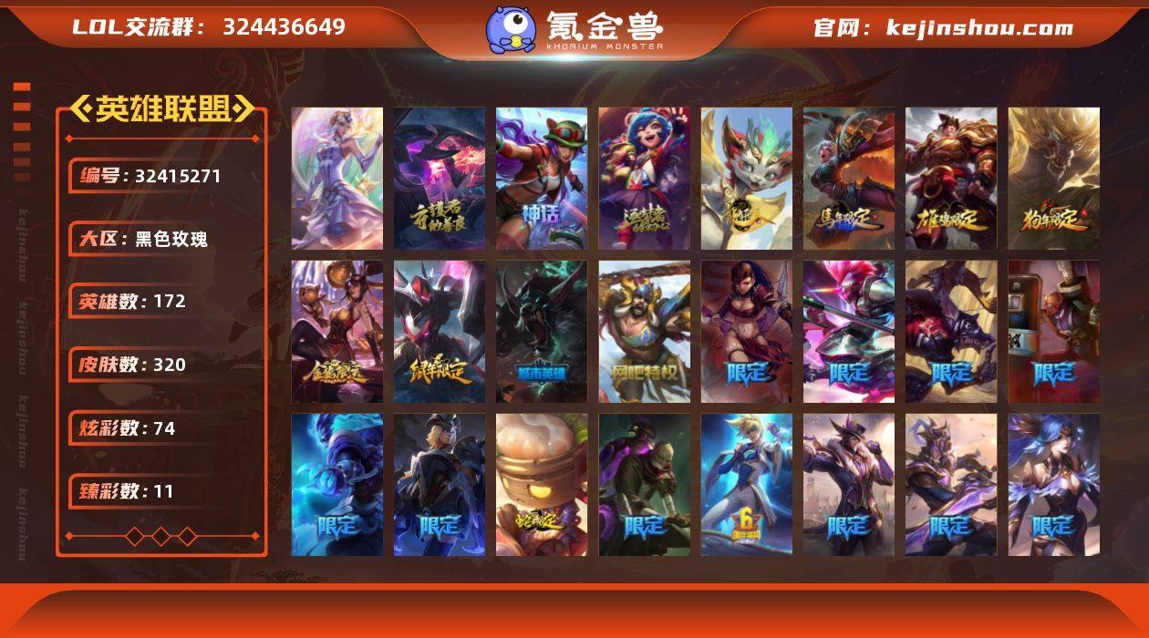 实名:可二次实名 英雄数:172 皮肤数:398 等级:682 炫彩数:154 臻彩皮肤总数:6 神话皮肤数:14 DJ-娑娜,未来战士,大元素使 至臻 暗星 墨菲特,至臻 征服者 贾克斯,至臻 神龙尊者 炎龙瑟提,至臻 星之守护者 索拉卡,海克斯 魔腾,恐惧新星 德莱厄斯,摄魂 薇恩,海克斯 安妮,暗星 科加斯,永恒之森 奥恩,黎明使者 卡尔玛,源代码 乐芙兰,10周年安妮 外星装甲 库奇,神龙之翼 库奇,广寒仙子 嫦娥,替父从军 花木兰,玉净夜叉 凯特琳,北辰之威 内瑟斯,征服者韦鲁斯,征服者阿利斯塔,暗影沃里克,野兽猎人泰达米尔,野兽猎人瑟庄妮,野兽猎人德莱文,破空枪骑孙悟空,女猎手希维尔,警用试作体K-9内瑟斯,惊悚派对费德提克,红桃杰克崔斯特,都铎王朝图奇,防暴士兵 辛吉德,冠军典狱长锤石,冠军之血 希瓦娜,冠军之隐 劫,钢铁军团 拉克丝,2周年德莱厄斯,3周年厄运小姐,5周年阿狸,6周年伊泽瑞尔,觅心猎手薇恩,觅心游侠卢锡安,胜利女神 奥莉安娜,胜利之剑 亚托克斯,胜利枪神卢锡安,S1FNC酒桶,S1FNC迦娜,S1FNC嘉文四世,S2暗杀星发条,S2暗杀星蒙多,S2暗杀星慎,S2暗杀星伊泽瑞尔,S3SKTT1贾克斯,S4SSW锤石,S4SSW图奇,S4SSW炼金,S5SKTT1阿利斯塔,S6SKTT1扎克,S6SKTT1娜美,冰雪兽纳尔,胡桃夹子 萨科,圣诞狂欢 努努和威朗普,圣诞玩偶波比,邪恶圣诞老人维迦,雪默丁格,雪装奈德丽,英勇玩具兵 普朗克,泳池派对 奥莉安娜,泳池派对 格雷福斯,泳池派对厄运小姐,泳池派对李青,泳池派对 塔莉垭,鬼影森森茂凯,鬼影重重魔腾,灵魂收割者索拉卡,南瓜头费德提克,无头骑士 赫卡里姆 战地机甲 厄加特,宇航员 诺提勒斯,双重冰晶 艾尼维亚,苹果机器人 布里茨,欧米伽小队 幽灵特工,女主播 迦娜,女皇 艾希,钢铁之翼 凯尔,符文战熊 沃利贝尔,地狱之门卫士 加里奥,冰川巨兽 墨菲特,奥德赛 凯隐,真实伤害 艾克,约德尔国队长 提莫,源计划:林 易,泳池派对吉格斯,血石领主 弗拉基米尔,西部魔影 卢锡安,未来战士 凯特琳,铁哥们儿 奥拉夫,天煞 劫,死亡骑士 盖伦,神王 德莱厄斯,神拳 李青,绅士 科加斯,丧尸 布兰德,女校长 菲奥娜,律政大亨 蒙多,烈焰雄心 崔丝塔娜,炼狱魔犬 内瑟斯,枯萎之壤 泽拉斯,金牌主播 德莱文,黑夜使者 亚索,合金巨兽 努努和威朗普,灌篮高手 德莱厄斯,钢铁军团 盖伦,恶魔男爵 瑞兹,第三类接触 黑默丁格,大天使长米迦勒 凯尔,苍穹之光 韦鲁斯,冰霜亚龙 希瓦娜,暗星 锤石 深海妖姬 卡西奥佩娅,源计划: 风 亚索,腥红之月 亚索,西部牛仔 亚索,黑帮狂花 金克丝,邪恶魔人 扎克,战场公主 希维尔,暗黑武士 雷恩加尔,灰烬领主 奥瑞利安·索尔,五杀摇滚键盘手 娑娜,腥红之月 泰隆,穿着正装的恶魔 维迦,战争血统 蒙多,少林武僧 贾克斯,百夫长 贾克斯,圣光审判 凯尔,兔宝宝 提莫,刺客信条 凯南,蓝焰梦魔 魔腾,掠星魔刃 卡萨丁,银河魔装机神 菲兹,海牛猎手 菲兹,源代码 卡蜜尔,职业杀手 卢锡安,勇敢的心 奎因,血石诅咒 塔里克,深海怪鱼 克格莫,帝王斑蝶 克格莫,重生之沙 费德提克,源代码 索拉卡,飞车暴走族 古拉加斯,炼金狂士 辛吉德,法老王朝 内瑟斯,卡尔萨斯·祸害之光,五星大厨 塔姆,女船长 厄运小姐,法国皇室 厄运小姐,殇之机器人 阿木木,战地机甲 斯卡纳,侍魂 易,天人合一 易,科学怪熊的新娘 安妮,熔火之心 拉莫斯,全金属狂潮 拉莫斯,上古战魂 雷克塞,铁甲