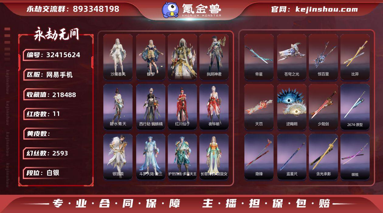 0B4P38网易手机11个红皮,奥义特效3个【神君印(岳山),初代机(沈妙),神乌造像(天海),】武器红皮7个【帝星,惊百里,比羿,逆晦朔,少阳剑,苍穹之光,天罚,】下次换绑时间2026/3/28,等待换绑期间可以登入网易大神直接进入游戏不影响游戏体验。网易支付未实名,道具货币都是默认已使用.其他红皮4个【执明神君,化生明王,沙漠香风,蝶梦,】昊天,观山海·腓腓,悟空,唐三,千秋匠心·青枝瓷,观山海·夏神祝融,巨阙,西行劫·蜘蛛精,夜华朝,银狼裘,护世四法·多闻天王,长歌诗韵·胡旋女,千秋匠心·玉叶景,武道无穷·少林,龙之影·过江龙,楚韵九歌·湘夫人,司天命,枫狩,观山海·冬神玄冥,护世四法·持国天王,干将莫邪,观山海·秋神蓐收,街头狂欢·不败擂主,黄昏巫主,护世四法·广目天王,夜绸袍,楚韵九歌·云中君,绮云衫,街头狂欢·涂鸦少女,咯咯,咕咕(连弩),封神录·申公豹,